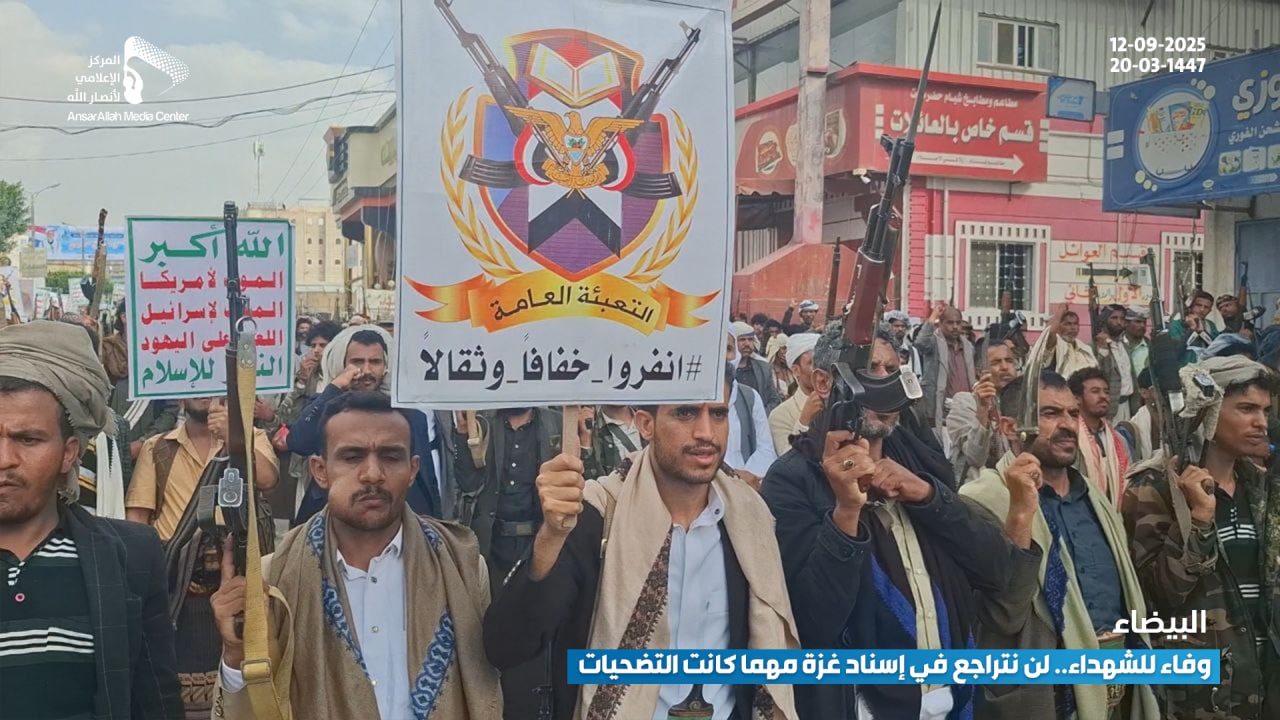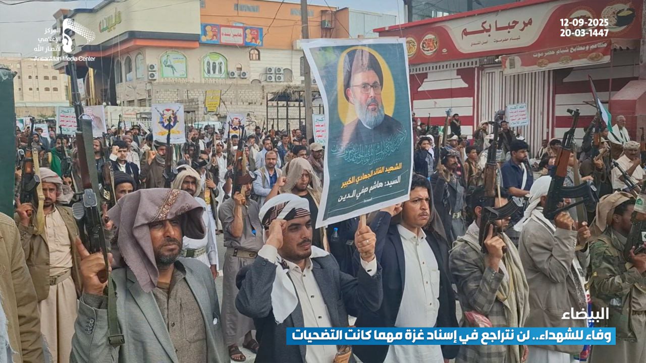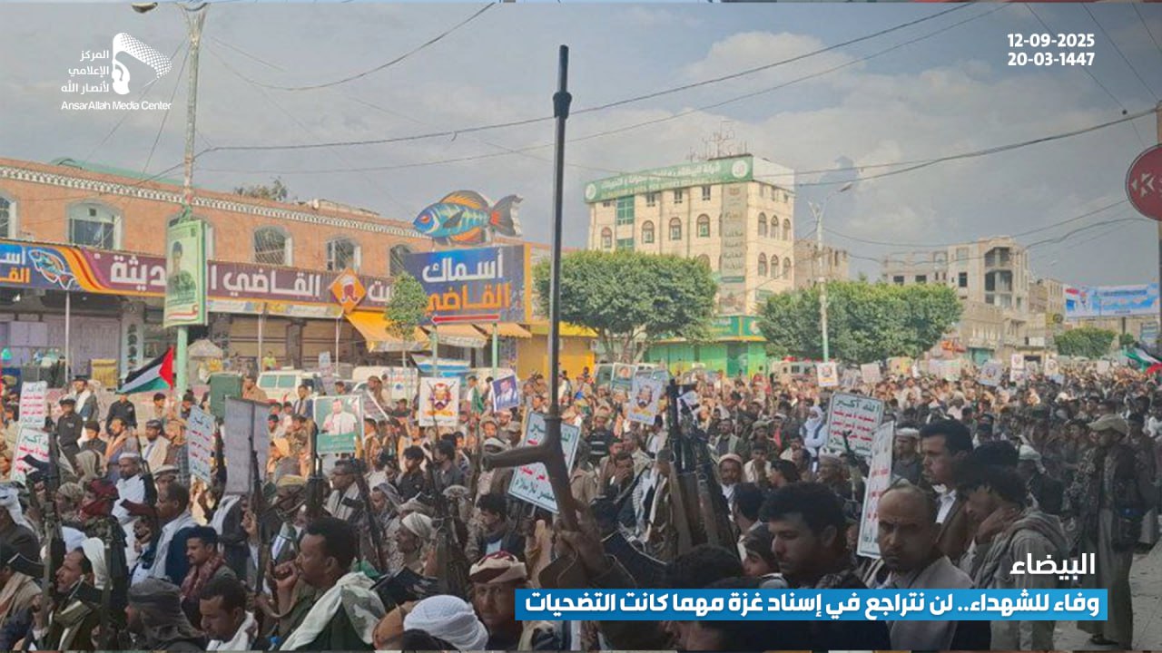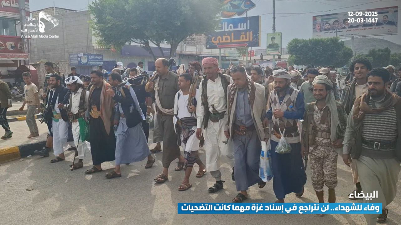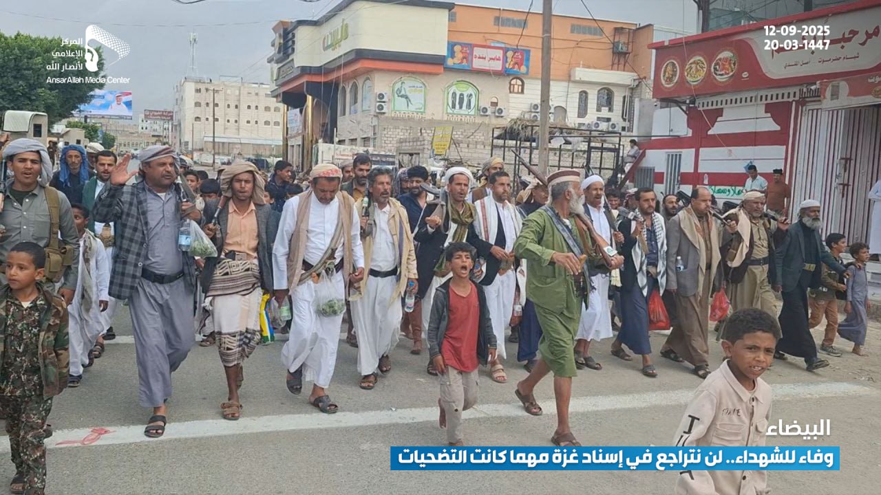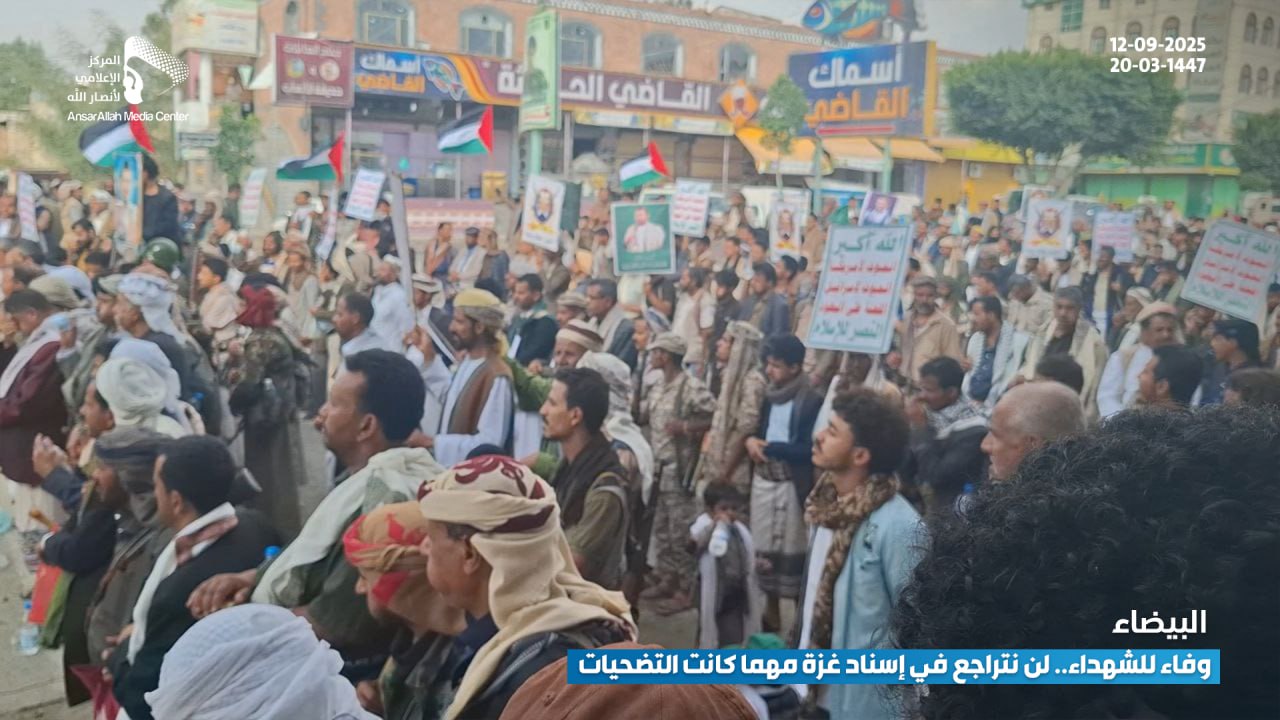 شهدت مدينة البيضاء، أمس الجمعة 12 سبتمبر 2025م، مسيرة جماهيرية حاشدة تحت شعار: “وفاء للشهداء.. لن نتراجع في إسناد غزة مهما كانت التضحيات”.