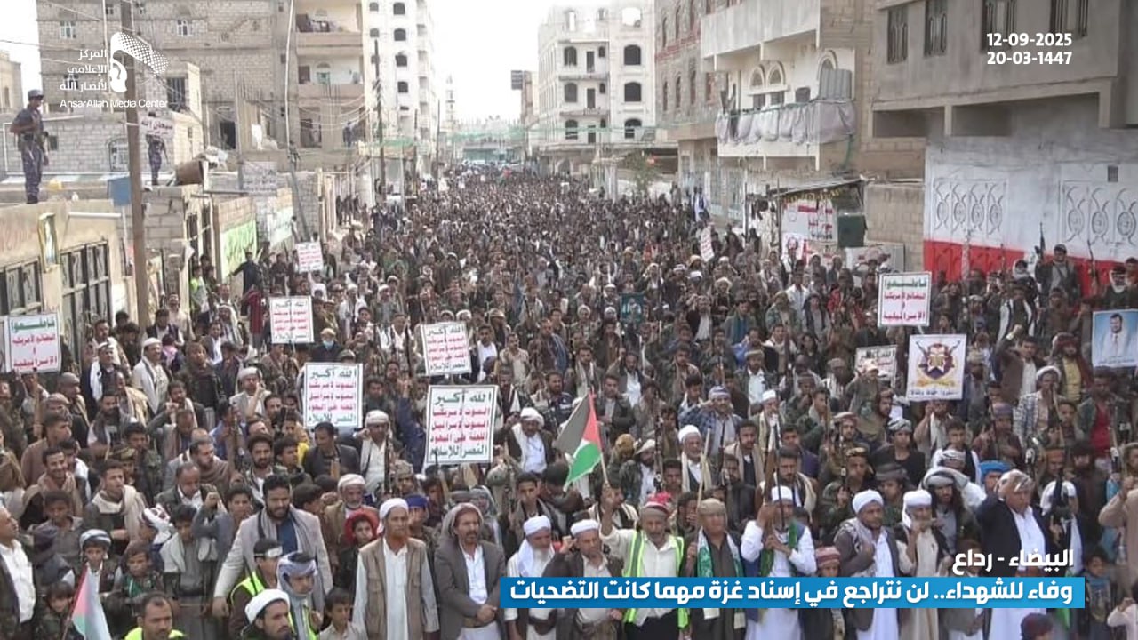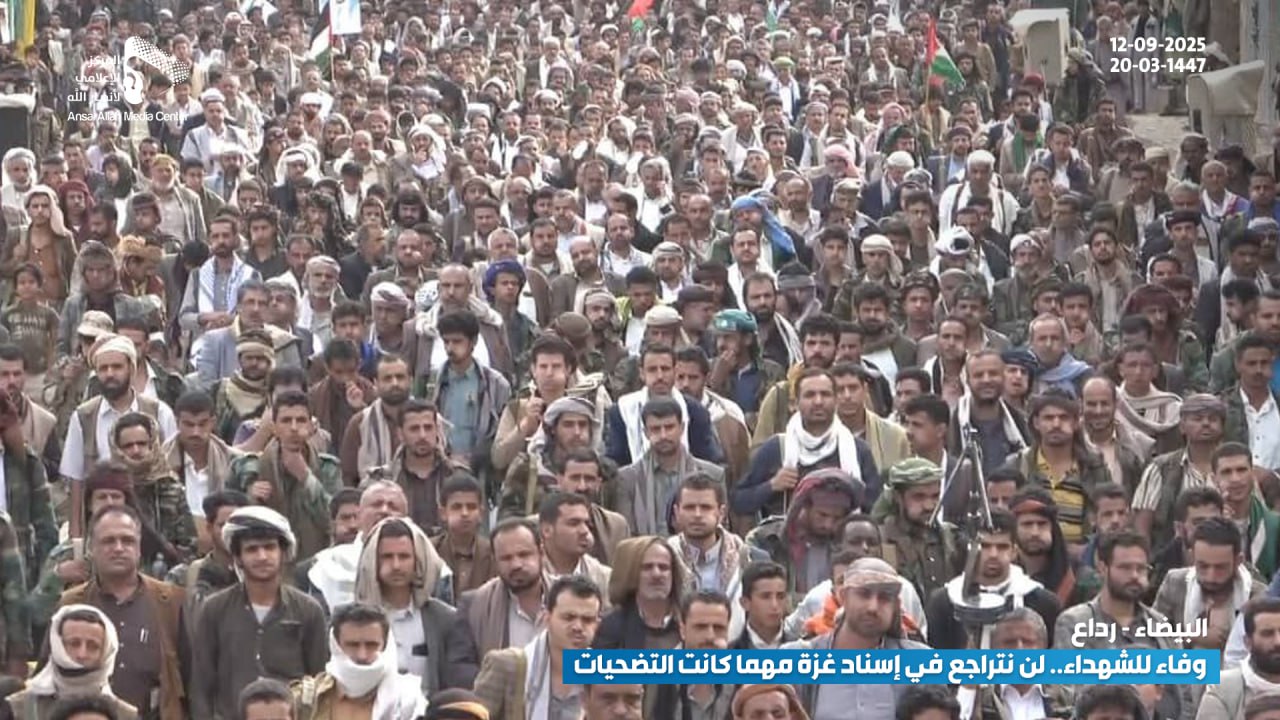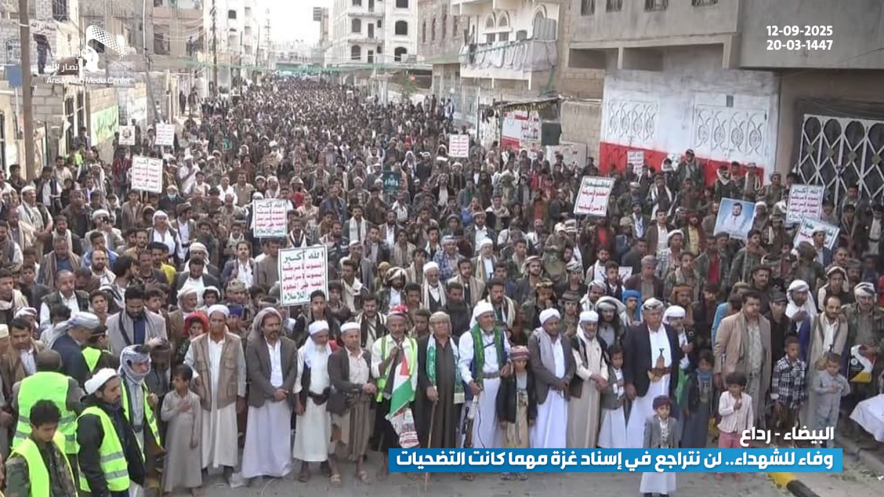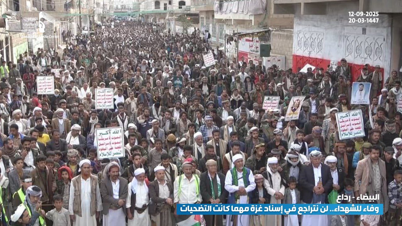 شهدت مديرية رداع بمحافظة البيضاء مسيرة جماهيرية حاشدة تحت شعار: “وفاء للشهداء.. لن نتراجع في إسناد غزة مهما كانت التضحيات”، يوم أمس الجمعة 12 سبتمبر 2025 / 20-03-1447هـ.
