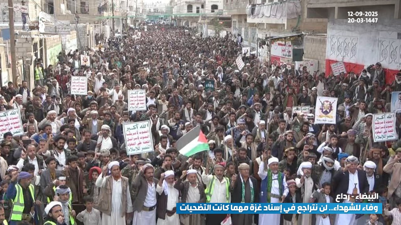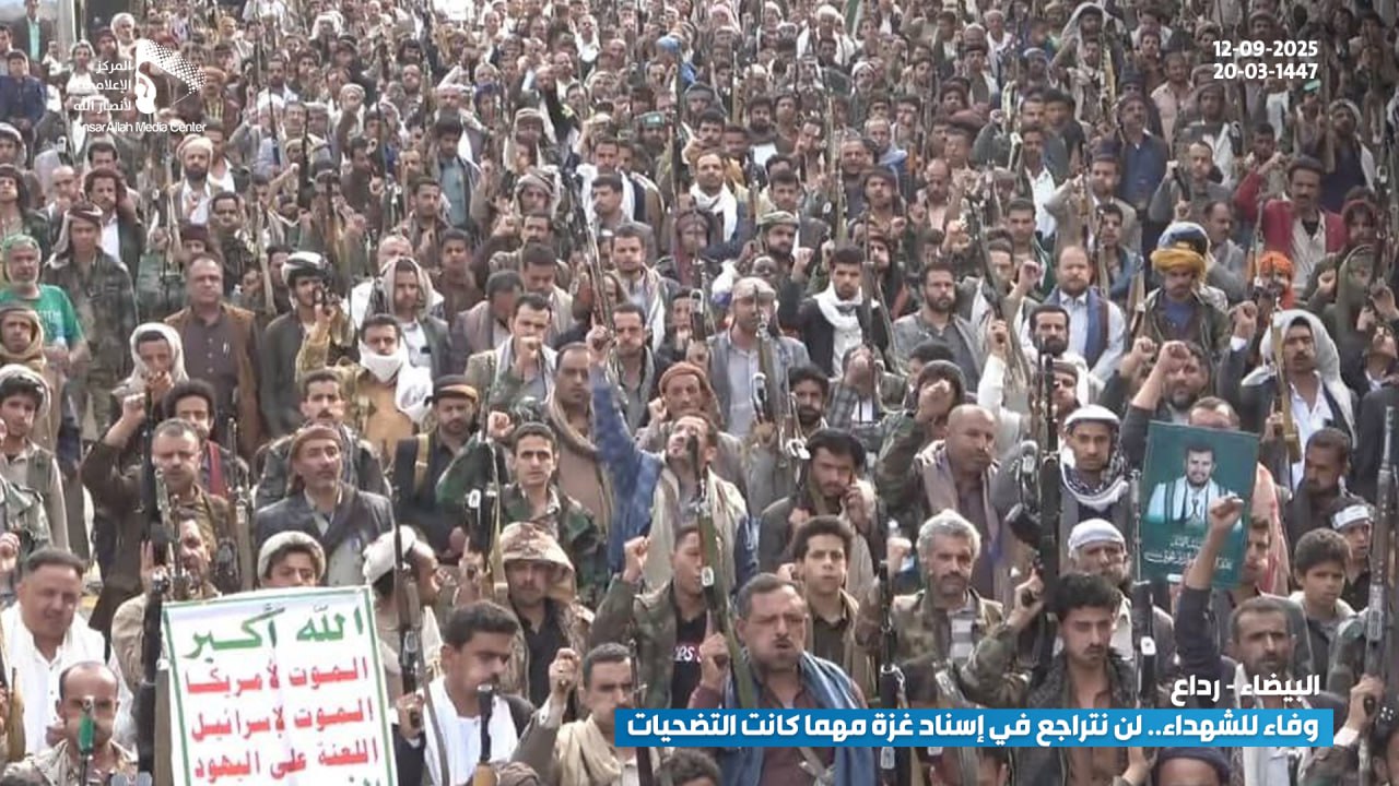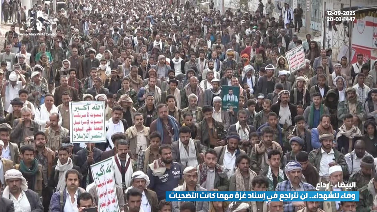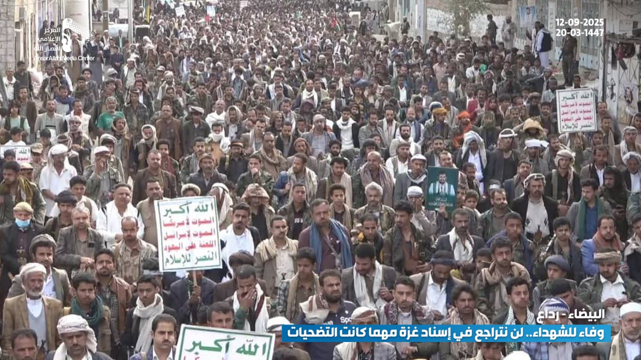 شهدت مديرية رداع بمحافظة البيضاء مسيرة جماهيرية حاشدة تحت شعار: “وفاء للشهداء.. لن نتراجع في إسناد غزة مهما كانت التضحيات”، يوم أمس الجمعة 12 سبتمبر 2025 / 20-03-1447هـ.