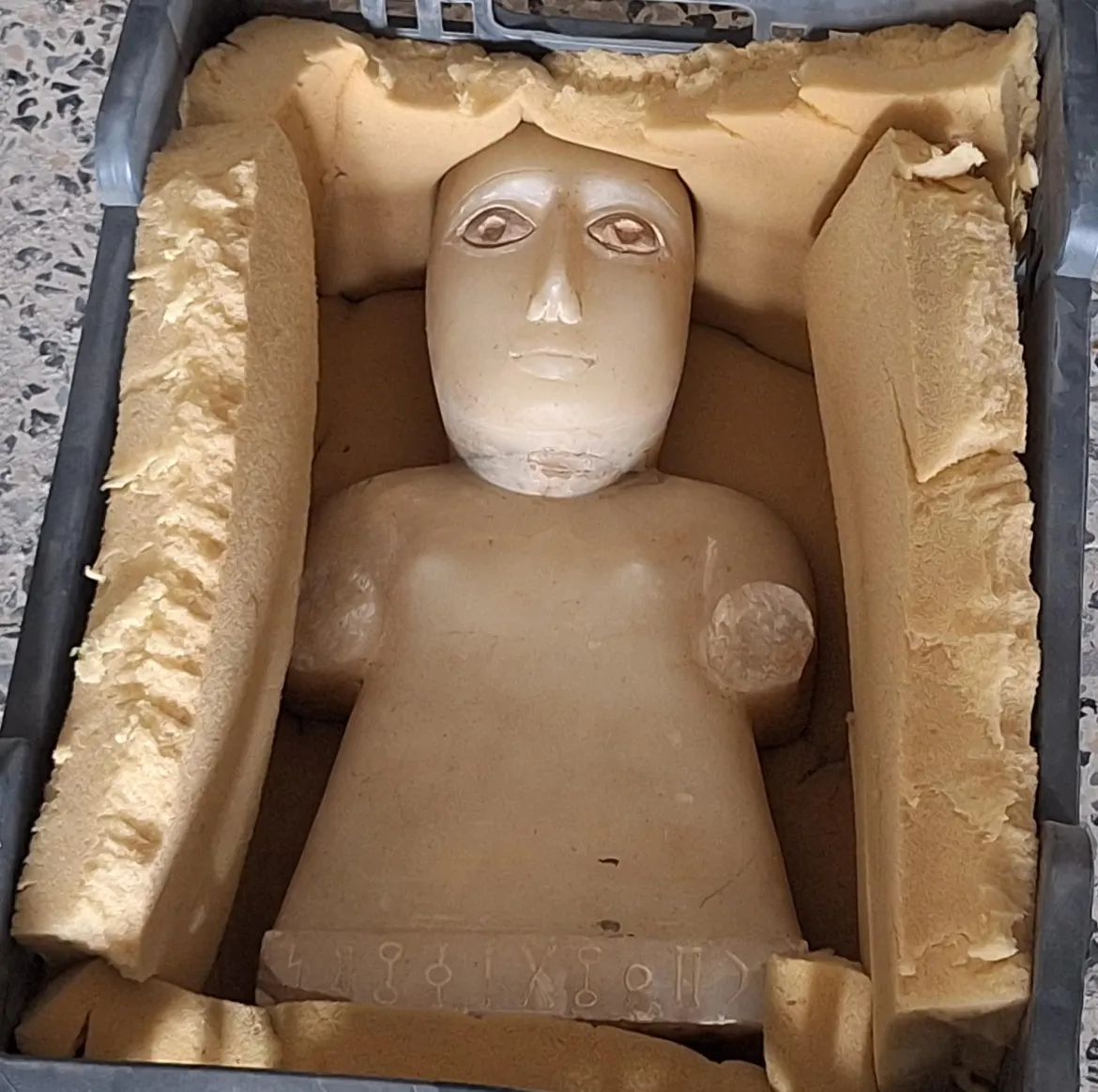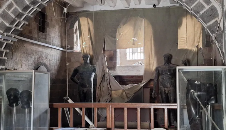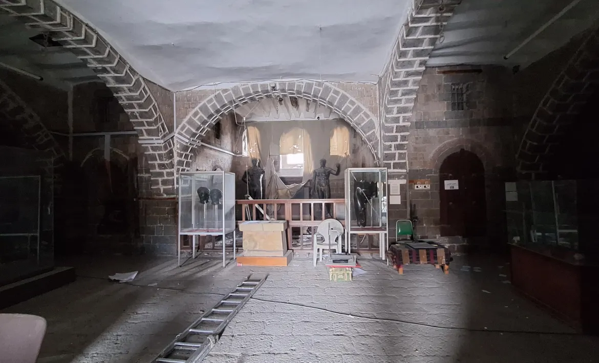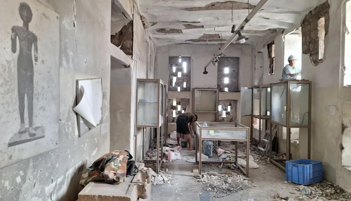 تمثال الملك ذمار علي يهبر وقطع أثرية نادرة تتناثر وسط الغبار والزجاج المتكسر بعد القصف الإسرائيلي على المتحف الوطني بصنعاء.