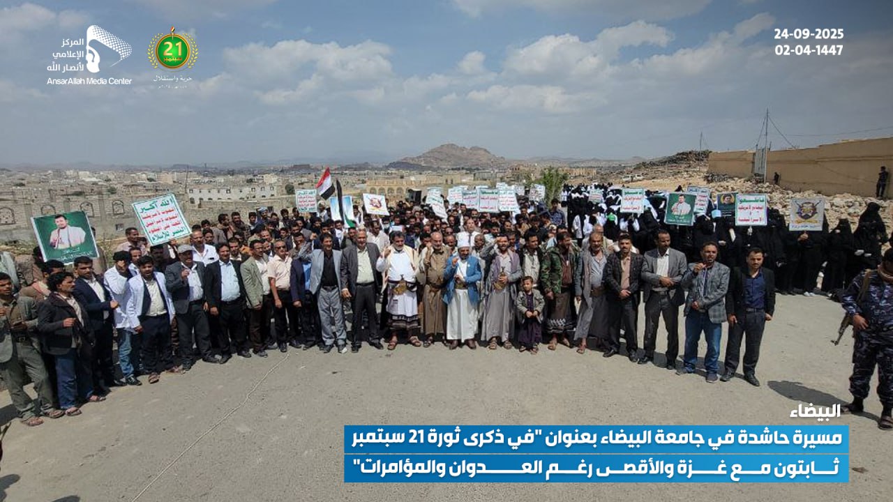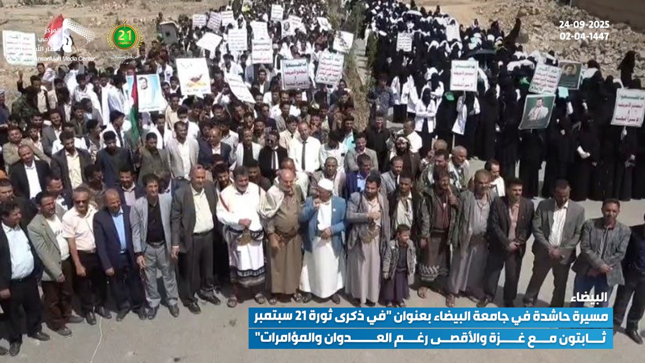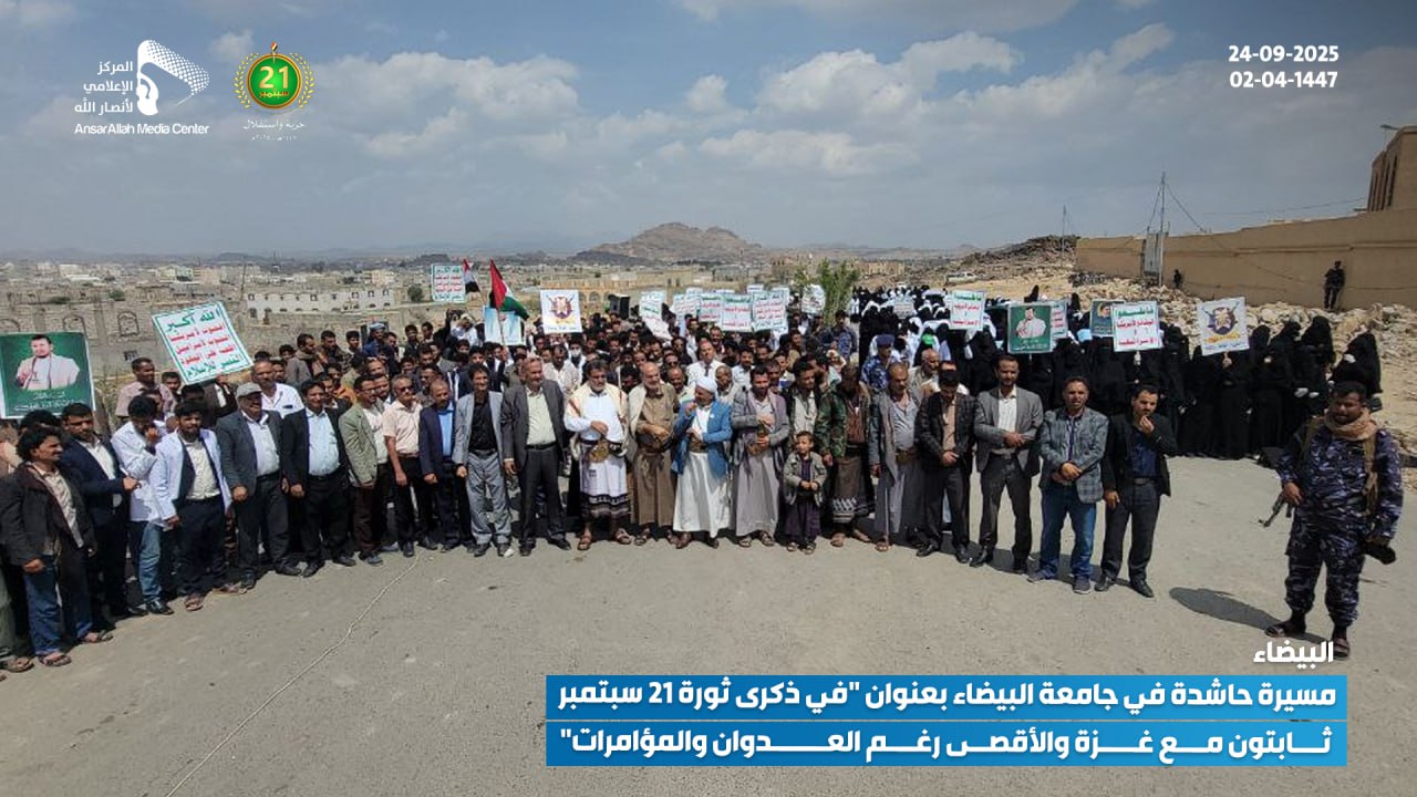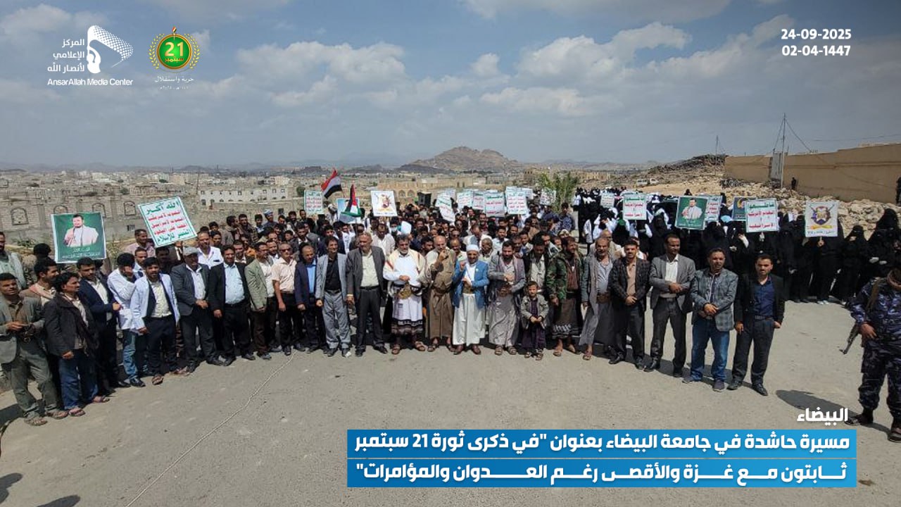 نظمت جامعة البيضاء اليوم، الأربعاء 24 سبتمبر 2025 (02-04-1447 هـ)، مسيرة حاشدة تحت شعار: “في ذكرى ثورة 21 سبتمبر.. ثابتون مع غزة والأقصى رغم العدوان والمؤامرات”.