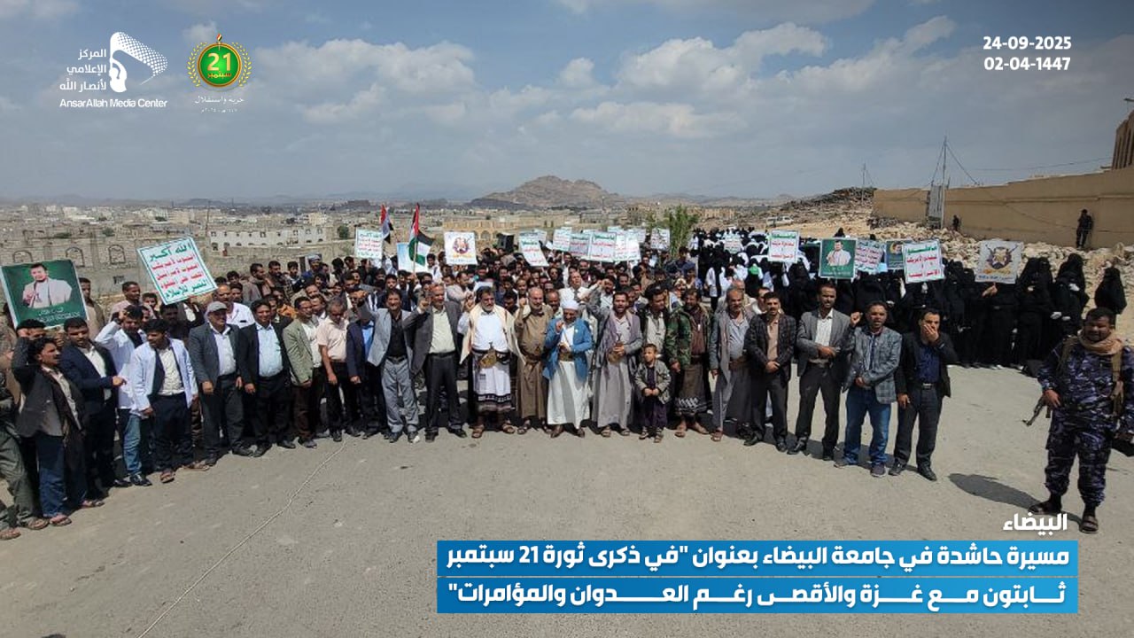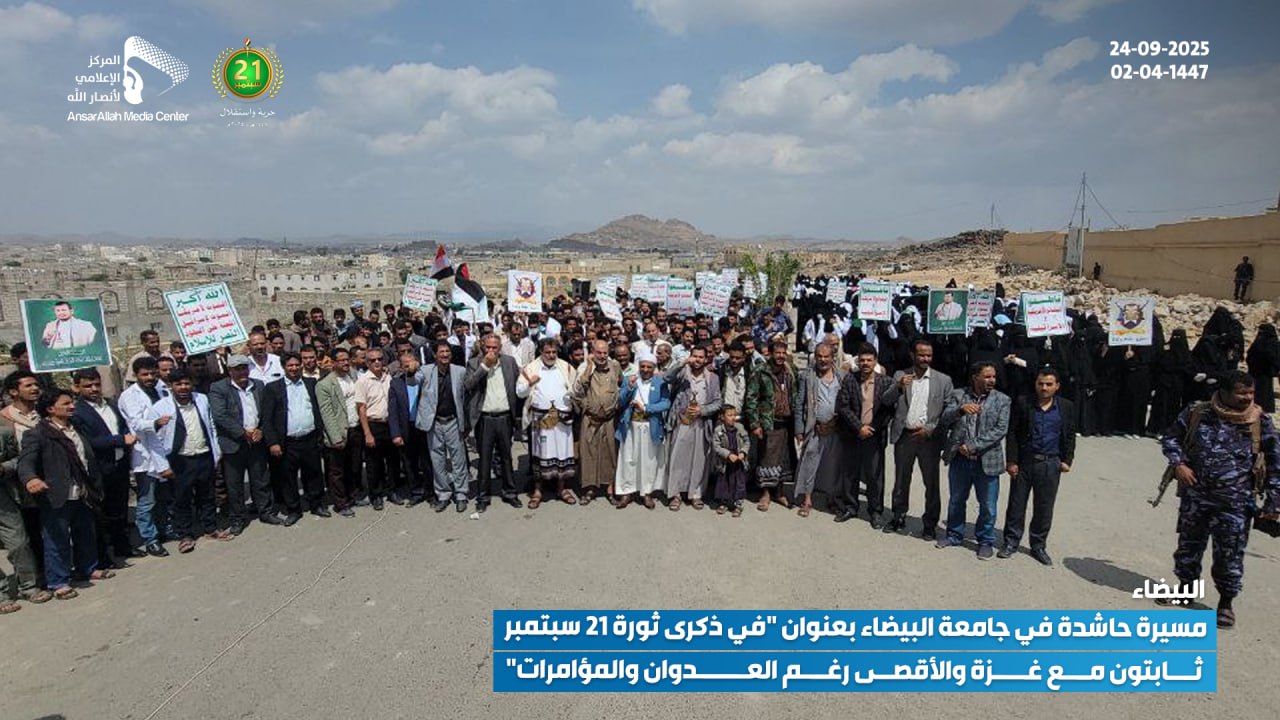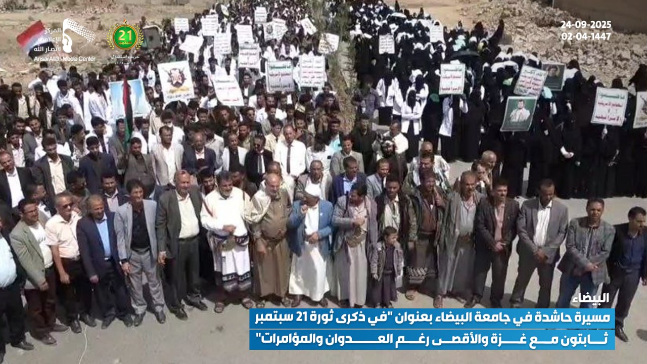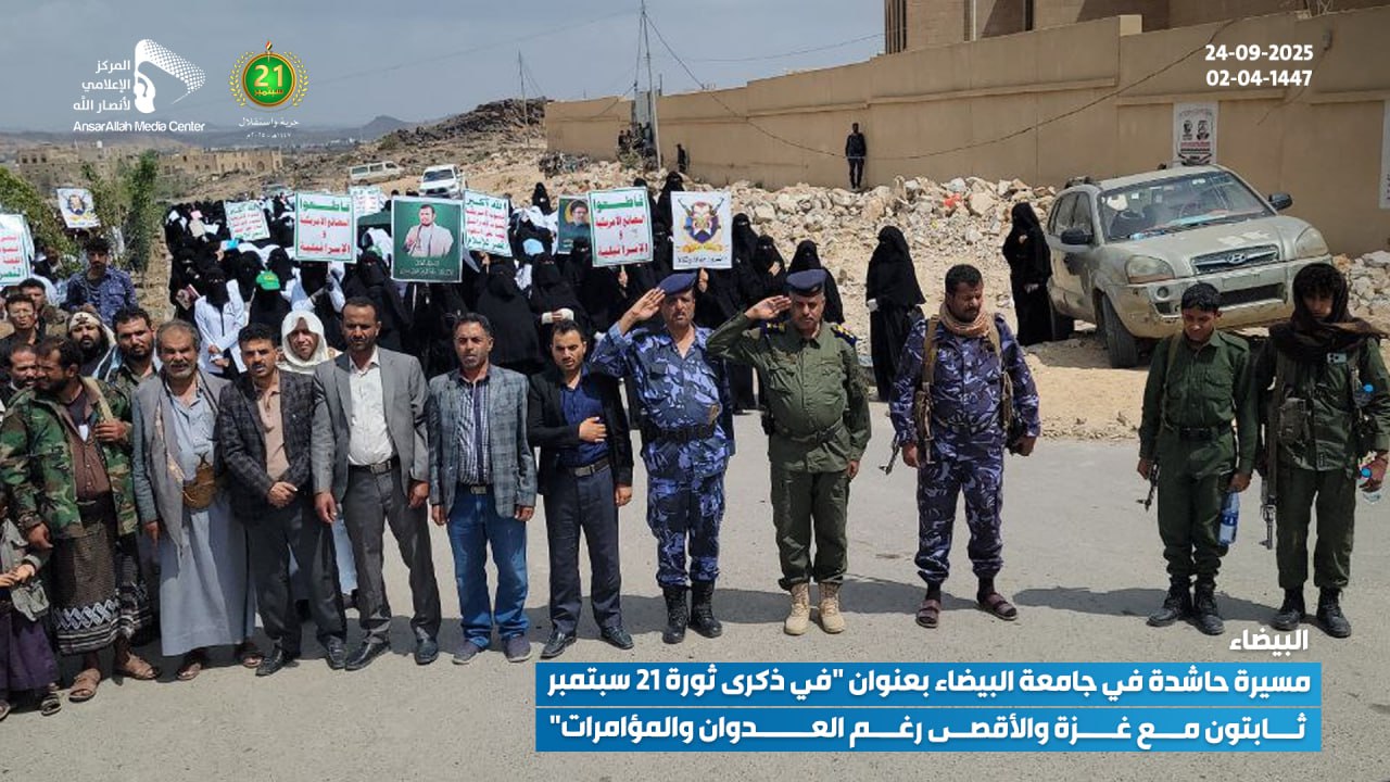 نظمت جامعة البيضاء اليوم، الأربعاء 24 سبتمبر 2025 (02-04-1447 هـ)، مسيرة حاشدة تحت شعار: “في ذكرى ثورة 21 سبتمبر.. ثابتون مع غزة والأقصى رغم العدوان والمؤامرات”.