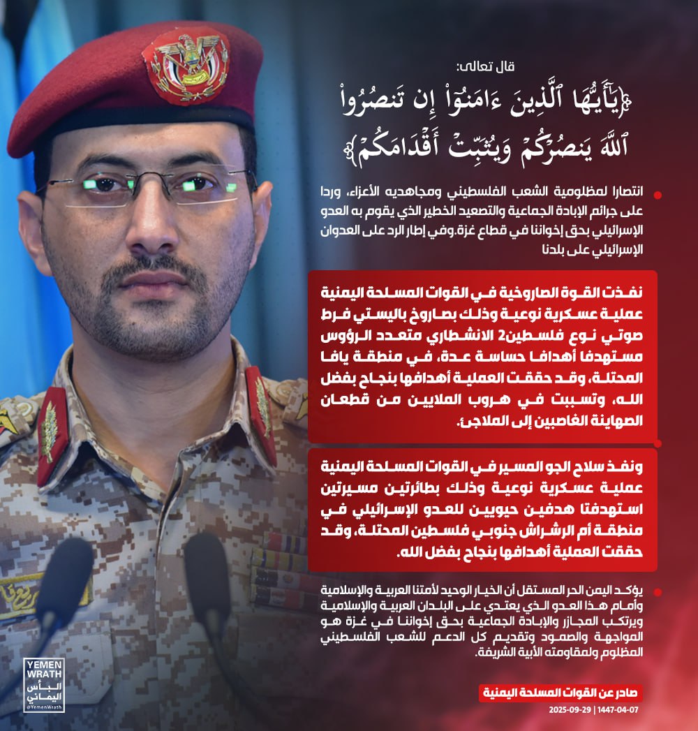 بيان القوات المسلحة اليمنية بشأن تنفيذ عمليتين عسكريتين أولاهما استهدفت أهدافا حساسة للعدو الإسرائيلي في منطقة يافا المحتلة وذلك بصاروخ باليستي فرط صوتي نوع #فلسطين2 الانشطاري متعدد الرؤوس، والأخرى استهدفت هدفين حيويين للعدو الإسرائيلي في منطقة أم الرشراش وذلك بطائرتين مسيرتين.