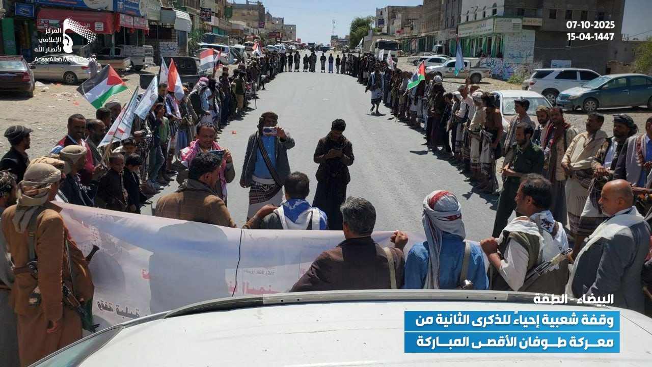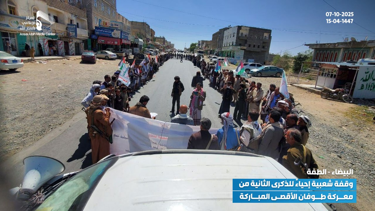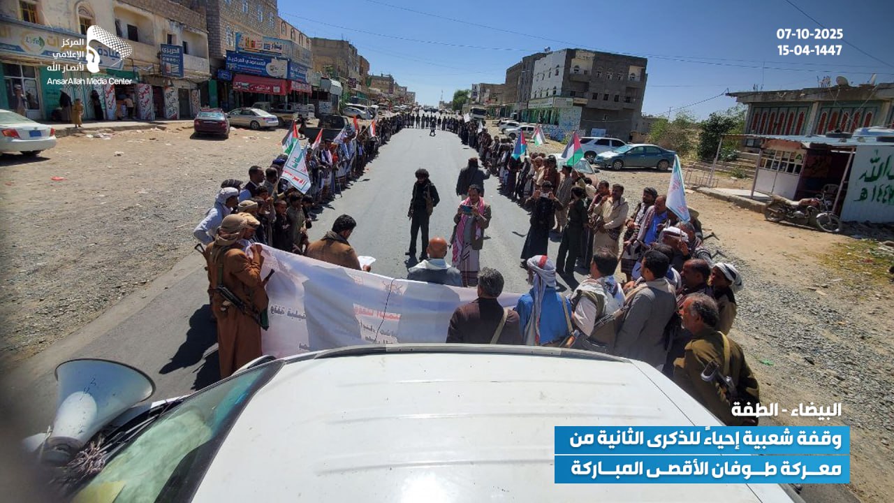شهدت مديرية الطفة بمحافظة البيضاء وقفة شعبية حاشدة إحياءً للذكرى الثانية لمعركة طوفان الأقصى المباركة، في 15 من شهر ربيع الآخر 1447 هـ الموافق 7 أكتوبر 2025م، حيث شارك الأهالي في فعاليات تأكيدًا على التلاحم الوطني وإبراز مكانة المعركة في الذاكرة الجماعية للمجتمع المحلي.