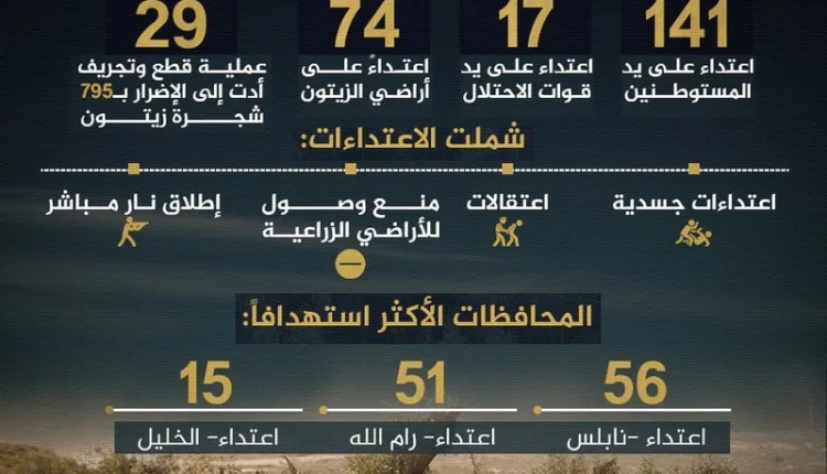 وأشار البيان، مستنداً إلى بيانات هيئة مقاومة الجدار والاستيطان، إلى أن 74 اعتداءً استهدفت أشجار الزيتون مباشرة، نتج عنها تدمير وإتلاف ما يقارب 795 شجرة زيتون، شملت 29 عملية قطع وتجريف.
