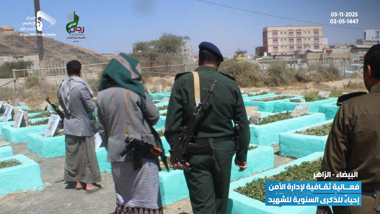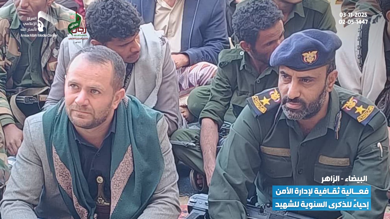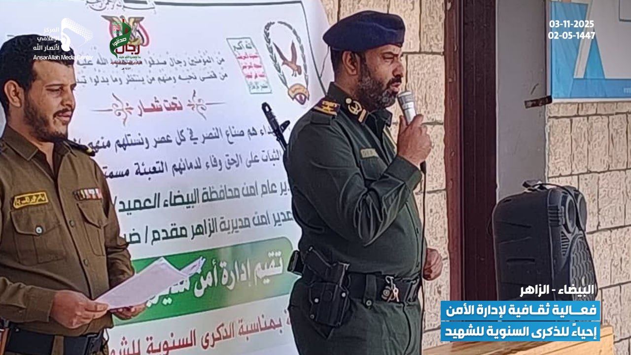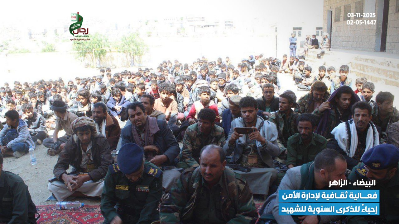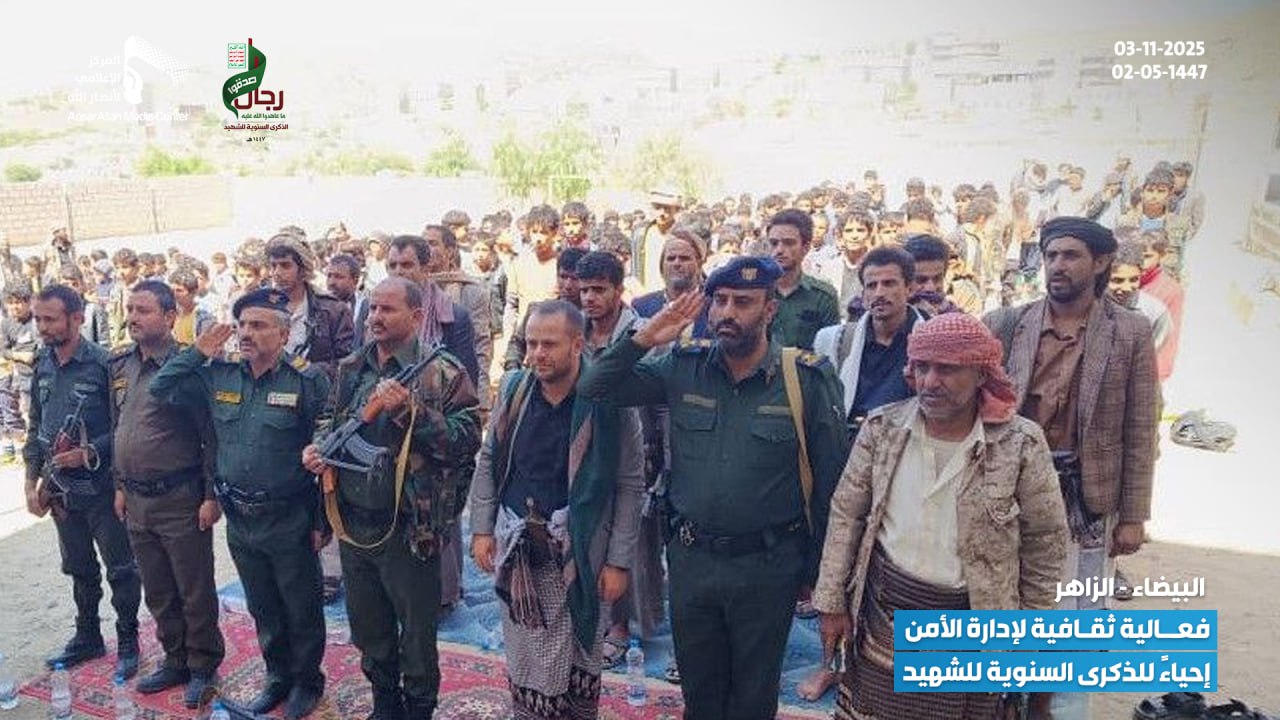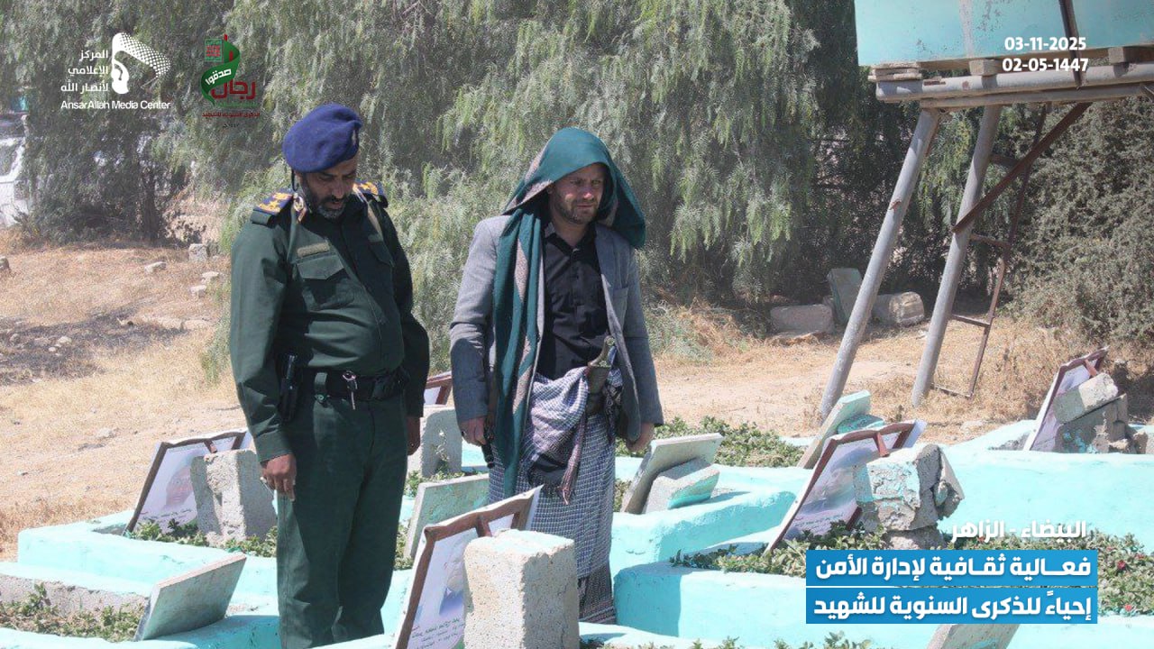 أقامت إدارة أمن مديرية الزاهر بمحافظة البيضاء زيارةً لروضة الشهداء، وتنظيم فعالية ثقافية، يوم أمس الموافق 03 نوفمبر 2025م، إحياءً للذكرى السنوية للشهداء 12-05-1447هـ، تكريمًا لتضحياتهم وبهدف تعزيز قيم الوفاء والانتماء لدى المجتمع المحلي.
