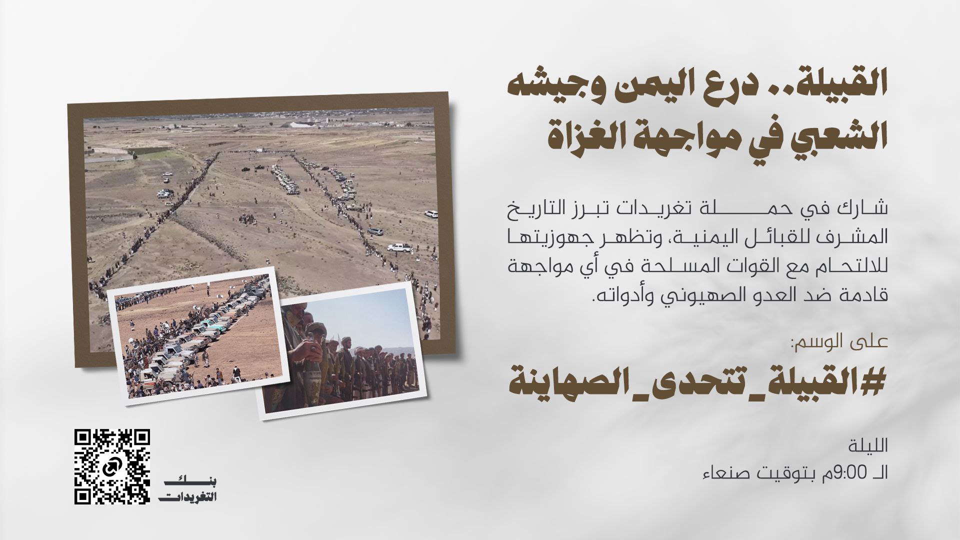 تنطلق الليلة حملة تغريدات واسعة تحت وسم #القبيلة_تتحدى_الصهاينة لتسليط الضوء على التاريخ المشرف للقبائل اليمنية ودورها كـدرع شعبي وجيش احتياطي في مواجهة الغزاة وأدواتهم.