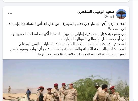 وقال الرميلي في منشور على حسابه بـ«فيسبوك»، ورصده موقع «الجديد برس»، إن التحالف نفّذ «مسرحية هزلية» انتهت بإسقاط أكبر محافظات اليمن وتسليمها لقوى المجلس الانتقالي الجنوبي المدعومة من الإمارات، بدلًا من دعم مؤسسات الدولة الشرعية.