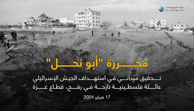 كشف المرصد الأورومتوسطي لحقوق الإنسان عن تفاصيل جريمة قتل جماعي ارتكبها الجيش الإسرائيلي بحق عائلة “أبو نحل” في رفح جنوبي قطاع غزة، يوم 17 فبراير 2024، أسفرت عن مقتل 15 مدنيًا بينهم 13 طفلًا وامرأة، دون أي تحذير مسبق أو مبرر عسكري.
