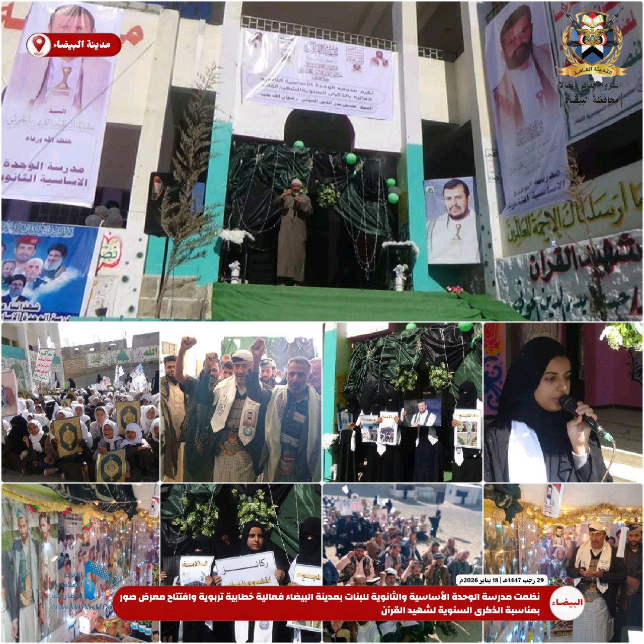 برعاية السلطة المحلية والتعبئة العامة، نظّمت مدرسة الوحدة الأساسية والثانوية للبنات بمدينة البيضاء فعالية خطابية تربوية، تزامنًا مع افتتاح معرض صور، إحياءً للذكرى السنوية لشهيد القرآن السيد حسين بدر الدين الحوثي، تحت شعار «شهيد القرآن» للعام 1447هـ، في إطار تعزيز القيم والهوية الإيمانية في أوساط الطالبات.