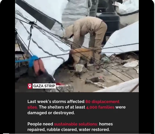 وقال المكتب في تدوينة على منصة “اكس”: “سوء الأحوال الجوية يُقوّض المكاسب الإنسانية التي تتحقق بشق الأنفس في غزة على الرغم من العقبات المستمرة”.