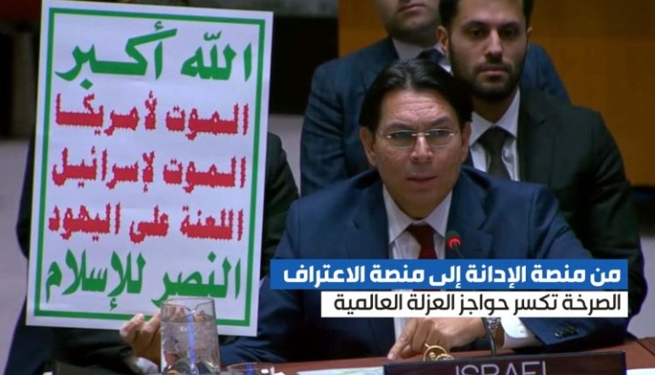 رفع الشعار داخل قاعة الأمم المتحدة لم يكن إدانة، بل اعترافًا قسريًا بالتأثير، فالذي لا وزن له لا يُرفع، والذي لا يُخشى لا يُستهدف، والذي لا حضور له لا يُحمل إلى منصة عالمية أمام الكاميرات.