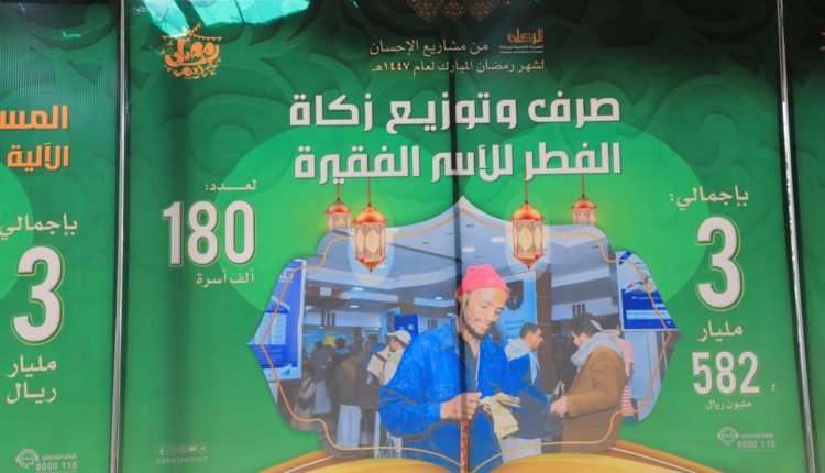 وفي التدشين الذي حضره أمين العاصمة الدكتور حمود عُباد، أكد رئيس الهيئة العامة للزكاة الشيخ شمسان أبو نشطان، أن مشاريع الإحسان الرمضانية توزعت على ثلاثة مجالات، الأول شمل مشاريع الصرف اللامركزي عبر مكاتب الزكاة بالأمانة والمحافظات الذي يصل خيره للأسر العاجزة عن العمل شهرياً لعدد 43 ألف أسرة بإجمالي مليارين و579 مليون ريال، والمساعدات النقدية للأسر الفقيرة لعدد 250 ألف أسرة بتكلفة 5 مليارات ريال، وصرف وتوزيع زكاة الفطر لعدد 180 ألف أسرة فقيرة بقيمة 3 مليارات و582 ألف أسرة، وكسوة العيد العينية بالأمانة لعدد 75 ألف مستفيد بإجمالي 475 مليون ريال، ومساعدات الغارمين لعدد ألف و 100 مستفيد بتكلفة 321 مليون ريال، والمساعدات العلاجية لعدد 4 آلاف مستفيد بتكلفة مليار ريال.