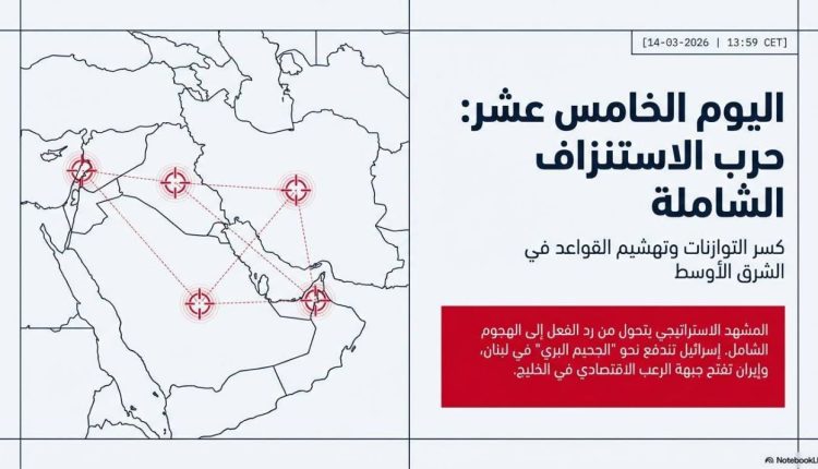 في منتصف اليوم الخامس عشر، وصلت “حرب الاستنزاف الشاملة” إلى منعطف خطير, فالميدان اللبناني يتحول إلى الفيصل الاستراتيجي، حيث تندفع إسـرائيل لغزو ما وراء الليطاني تحت غطاء “تسوية غــزة” بتواطؤ أمريكي، ليصطدم هذا الاندفاع بصلابة ح.ـزب الله الذي أقر بوضوح: “إما أن ننتهي في الحرب أو نغير المعادلة”.