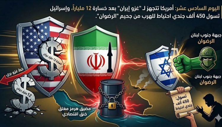 في نهاية اليوم السادس عشر من الحرب، ينهار مشروع “تغيير النظام” الغربي أمام جدار من الصواريخ الباليستية والألغام البحرية وكمائن “الرضوان”, الولايات المتحدة، التي أنفقت 12 مليار دولار حتى الآن دون تحقيق أهدافها، تفقد السيطرة وتلجأ للتلويح بعملية “إنزال بري” في إيران عبر المارينز، في مغامرة وصفها ديمقراطيون بـ “الانتحار”, وفي لبنان، تعيش إسرائيل صدمة دموية؛ فقوات الرضوان التي ظنت تل أبيب أنها أبادتها، تخوض معارك “من المسافة صفر”، مما دفع نتنياهو لطلب استدعاء 450 ألف جندي احتياط دفعة واحدة، في أكبر عملية حشد منذ عقود.