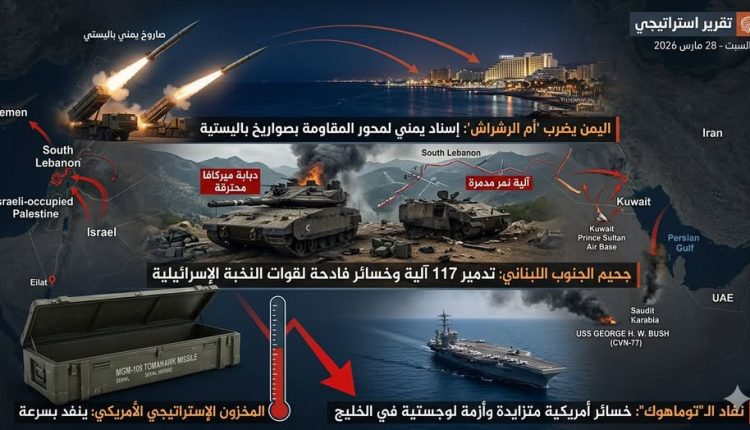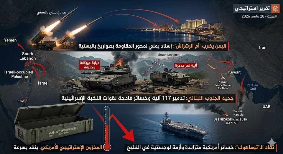 وفي لبنان، أثبت حزب الله أن كل جندي إسرائيلي يطأ أرض الجنوب مقتول أو جريح، حيث سُحقت وحدة “يهلوم” الهندسية في كمين نوعي، ليرتفع عدد الآليات الإسرائيلية المدمرة إلى 117 آلية. أما واشنطن، التي تستنجد بحاملة الطائرات “جورج بوش” بعد فرار سابقاتها، فتلقت صدمة لوجستية كبرى: مخزون صواريخ “توماهوك” الاستراتيجية ينفد بسرعة مرعبة، وقواعدها في السعودية والكويت تُدك بشكل يومي.