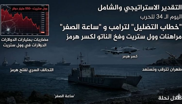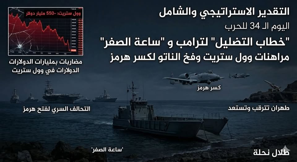 اليوم الرابع والثلاثون: “خطاب التضليل” لترامب.. مضاربات بمليارات الدولارات في وول ستريت، وفخ الناتو لكسر هرمز، والمارينز ينتظرون “ساعة الصفر”!
