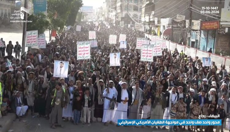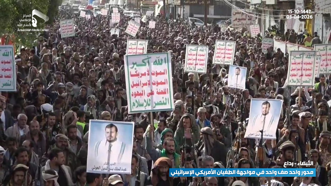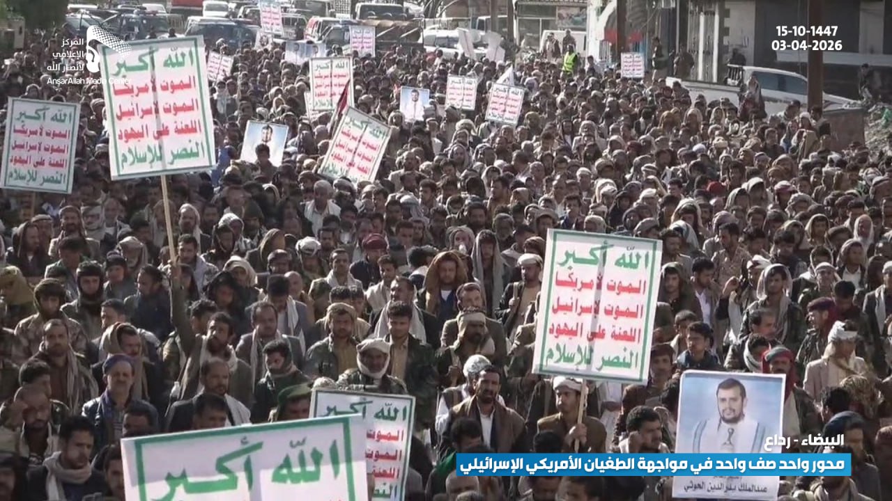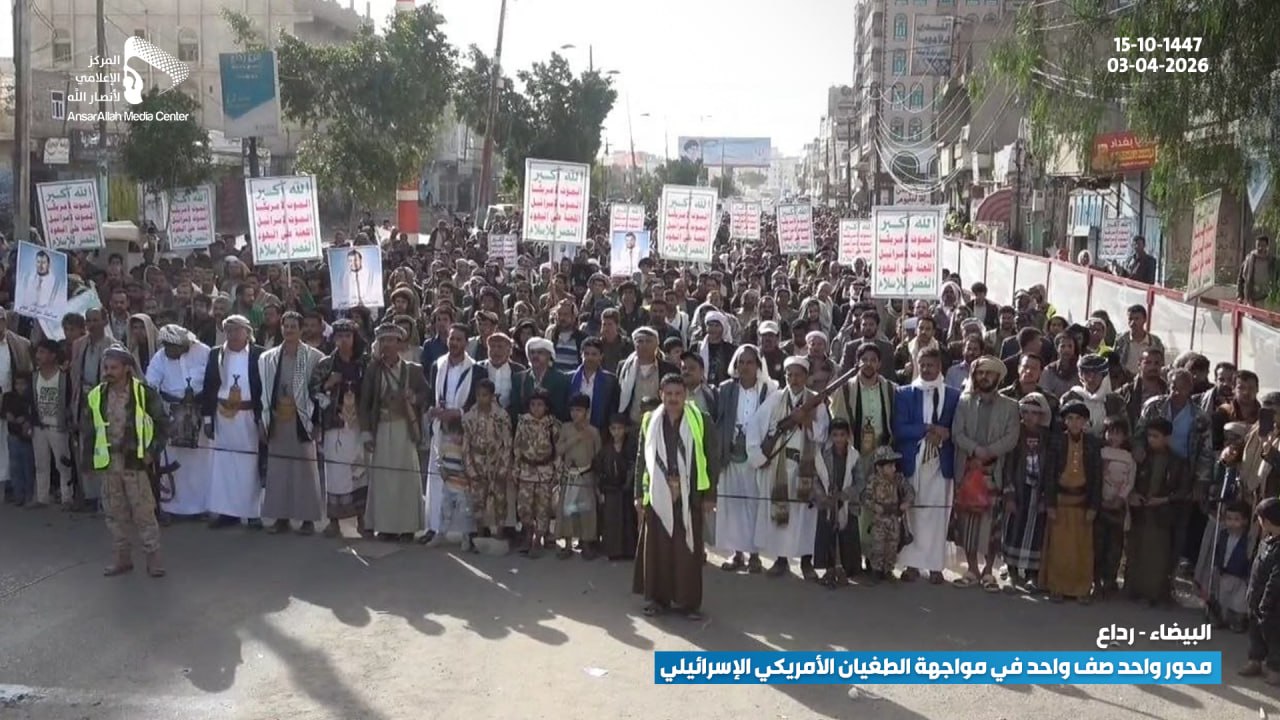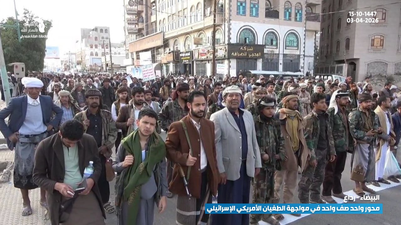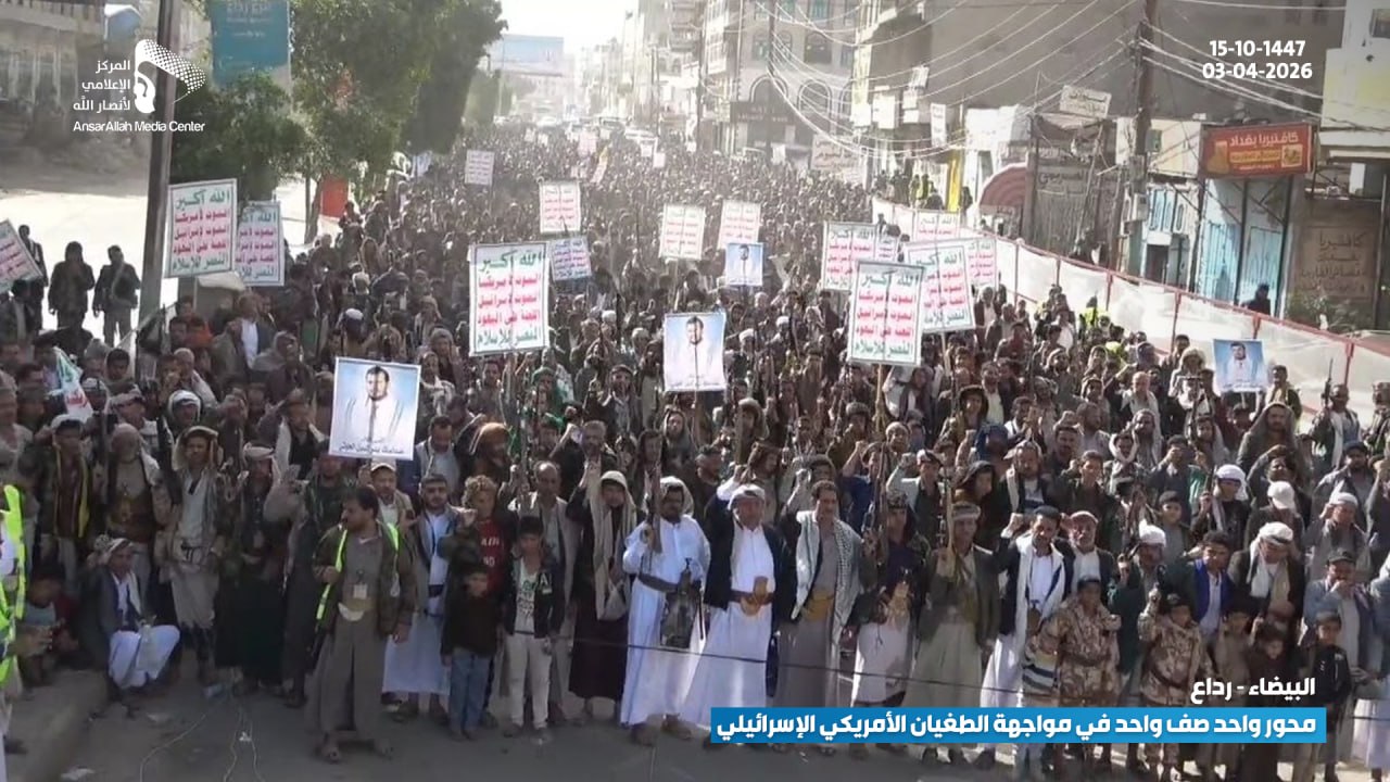 شهدت مديرية رداع في محافظة البيضاء أمس الجمعة 15-10-1447 هـ | 03-04-2026، مسيرة جماهيرية واسعة، تأكيدًا على وحدة الصف في مواجهة التدخلات الأمريكية والإسرائيلية، وتجسيدًا للتلاحم الوطني ضد الطغيان.