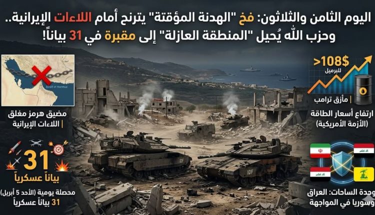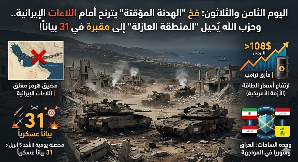 * ملحمة يوم الأحد: أصدر حزب الله 31 بياناً عسكرياً في يوم واحد (الأحد 5 أبريل). القراءة العسكرية لهذه البيانات تُثبت أن الحزب يطبق استراتيجية الإبادة الموضعية: