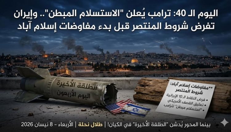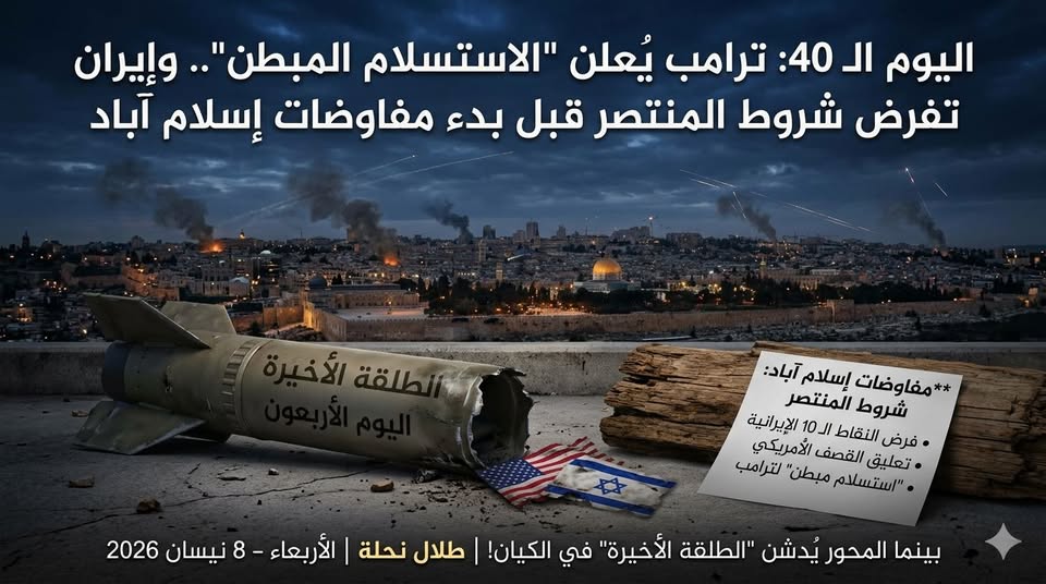 اليوم الأربعون: ترامب يُعلن “الاستسلام المبطن”.. وإيران تفرض شروط المنتصر قبل بدء مفاوضات إسلام آباد، بينما المحور يُدشن “الطلقة الأخيرة” في الكيان!