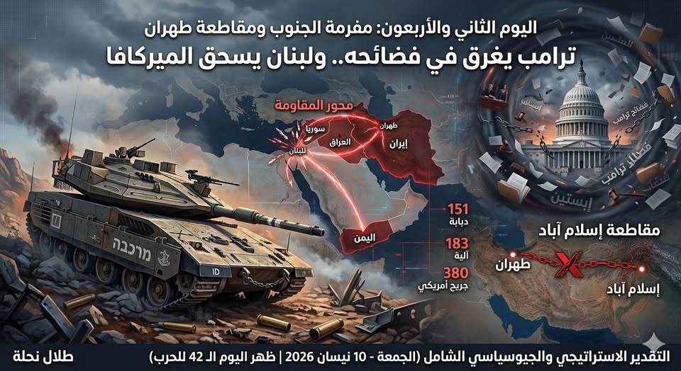 التقدير الاستراتيجي والجيوسياسي الشامل (الجمعة – 10 نيسان 2026 | ظهر اليوم الـ 42 للحرب):