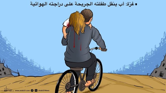 • كاريكاتير ؛ غزة: أب ينقل طفلته الجريحة على دراجته الهوائية