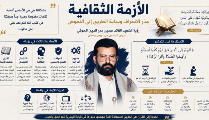 في زمن تتزاحم فيه التحديات على الأمة الإسلامية، يقدّم الشهيد القائد حسين بدر الدين الحوثي رضوان الله عليه، قراءة مختلفة لطبيعة الأزمة، قراءة لا تتوقف عند حدود السياسة أو الاقتصاد، بل تغوص عميقاً في الجذر الحقيقي، (الثقافة)، فبحسب هذه الرؤية، لم يكن التراجع وليد لحظة، بل نتيجة تراكمات ثقافية مغلوطة أعادت تشكيل وعي الإنسان المسلم، حتى بات بعيداً عن فطرته وعن مصدر هدايته الأول: القرآن الكريم.