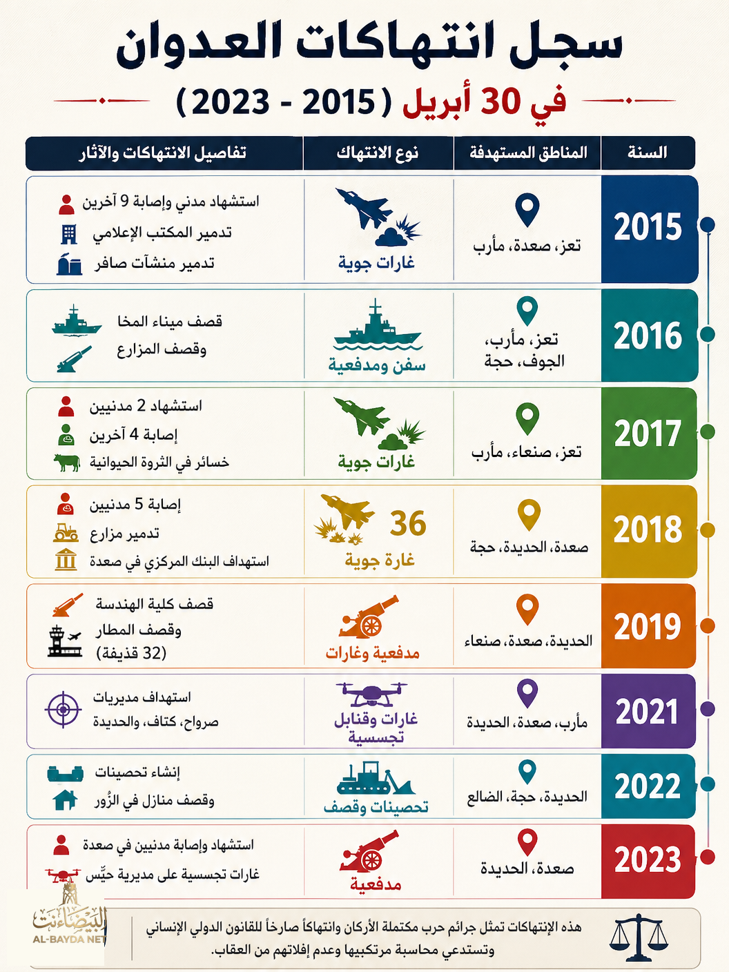 “فاتورة الجرائم في 30 أبريل: كيف تحول هذا التاريخ إلى شاهدٍ سنوي على انتهاكات العدوان؟”