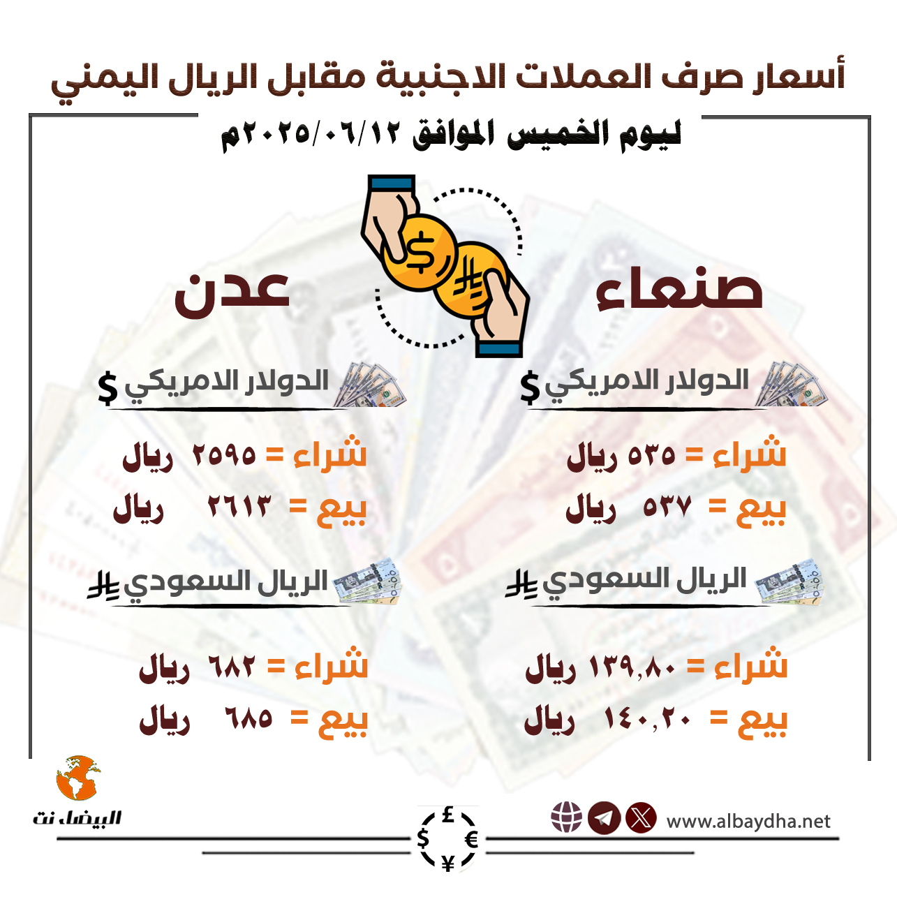 أسعار صرف الريال اليمني مقابل الدولار و السعودي الخميس – 12/06/2025 Share FacebookTwitterGoogle+ReddItWhatsAppPinterestEmail