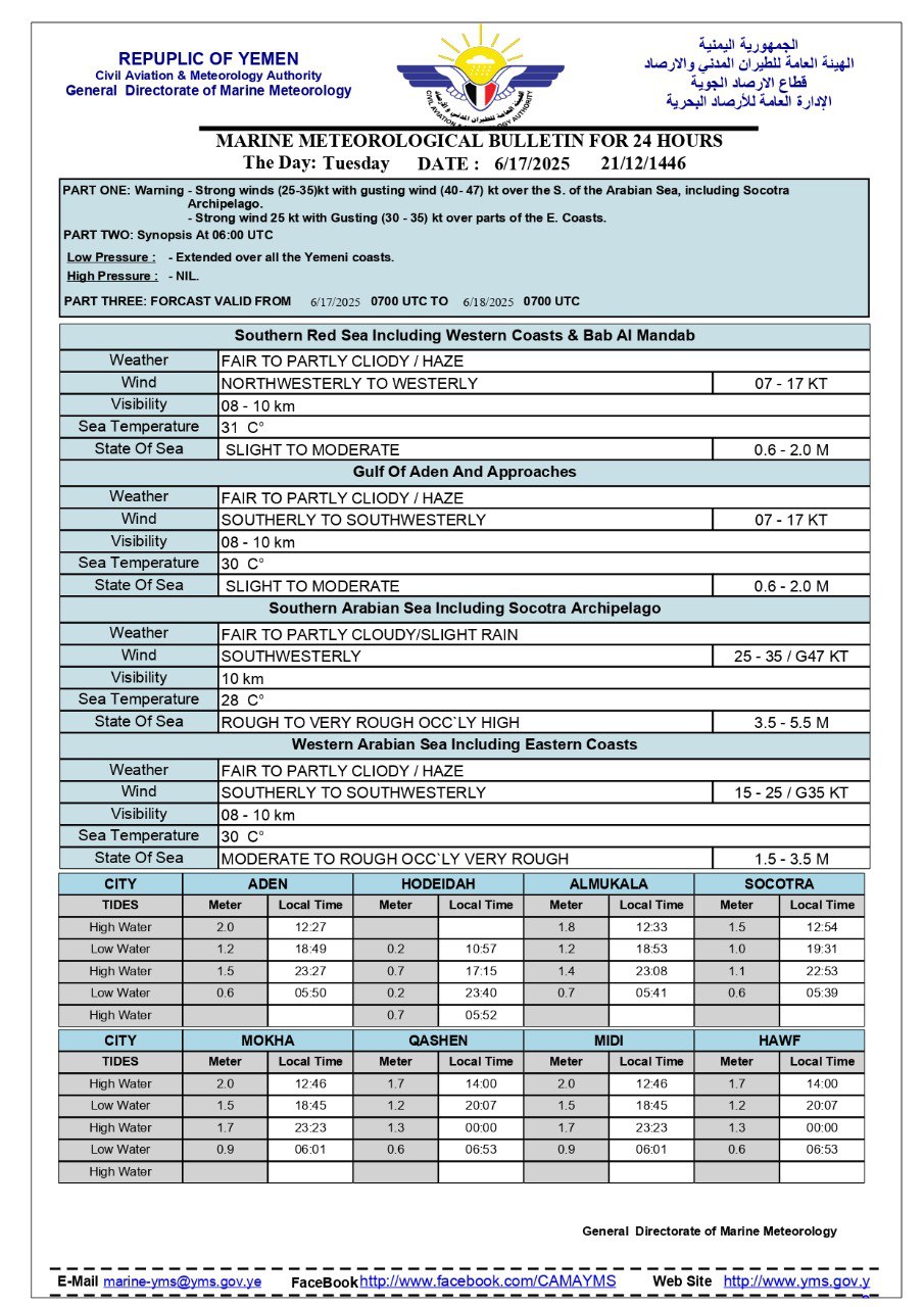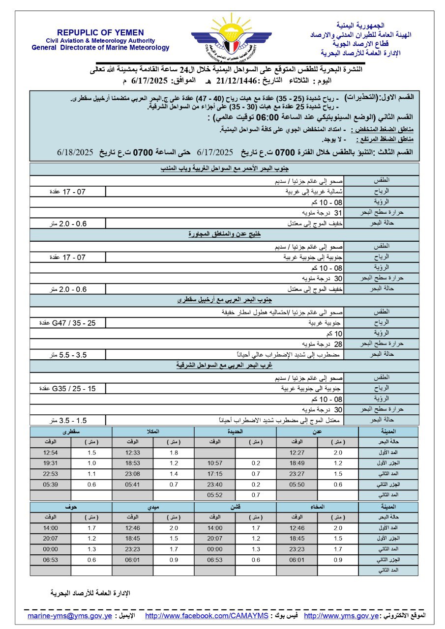 النشرة البحرية المتوقعة للـ 24 ساعة القادمة بمشيئة الله تعالى الثلاثاء 17/06/2025 Share FacebookTwitterGoogle+ReddItWhatsAppPinterestEmail