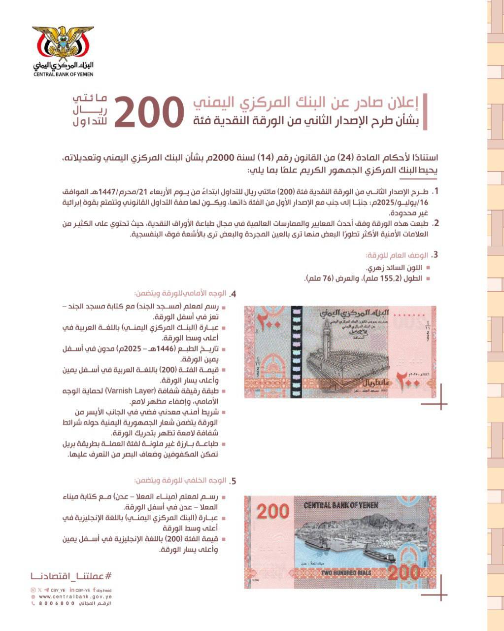 تصميم الإصدار الثاني من الورقة النقدية فئة 200 ريال يمني: يجمع بين مسجد الجند في تعز وميناء المعلا في عدن #البنك المركزي اليمني Share FacebookTwitterGoogle+ReddItWhatsAppPinterestEmail