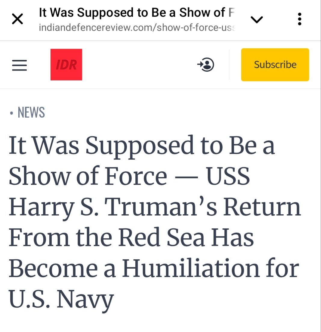 تقرير مجلة “إنديان ديفينس ريفيو” كشف أن عودة حاملة الطائرات الأمريكية “ترومان” من البحر الأحمر تحولت إلى إهانة للبحرية الأمريكية، بعدما كان من المفترض أن تكون عرضاً للقوة. الحاملة فشلت في كبح تهديدات جبهة اليمن التي استمرت بإطلاق الطائرات المسيّرة والصواريخ طوال فترة تواجدها، ما دفع البنتاغون إلى أمر بمراجعة شاملة لعمليات حاملات الطائرات.