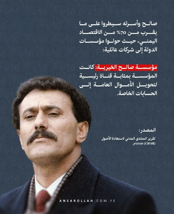 مؤسسة صالح الخيرية: حولها صالح إلى ذراع مالية لعائلته، حيث كانت تسيطر على عقود حكومية كبرى وفقًا لتقرير المنتدى المدني (2020)، “كانت المؤسسة بمثابة قناة رئيسية لتحويل الأموال العامة إلى الحسابات الخاصة”.