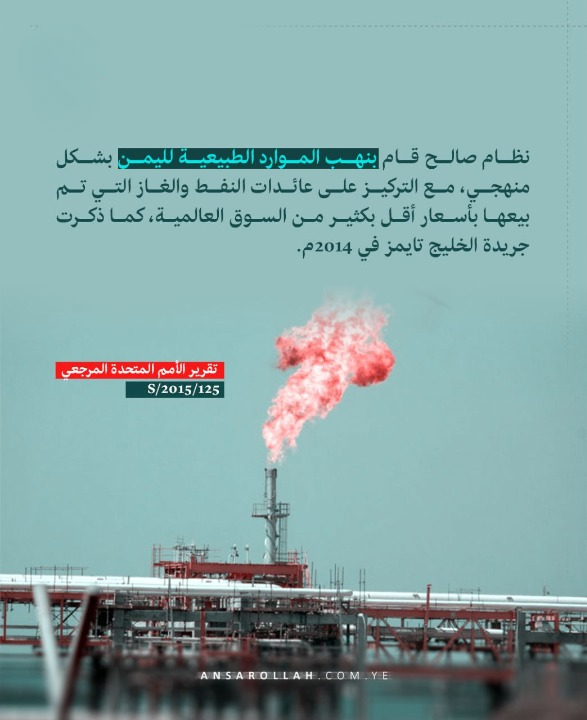 ويشير تقرير الأمم المتحدة المرجعي S/2015/125 إلى أن “نظام صالح قام بنهب الموارد الطبيعية لليمن بشكل منهجي، مع التركيز على عائدات النفط والغاز التي تم بيعها بأسعار أقل بكثير من السوق العالمية، كما ذكرت جريدة الخليج تايمز في 2014”.