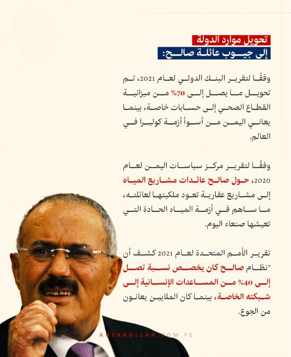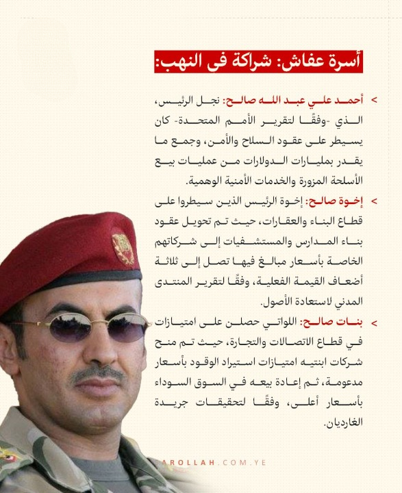 هذا التحقيق الاستقصائي -بعد مراجعة وثائق رسمية من الأمم المتحدة ومؤسسات دولية وتحقيقات صحفية دولية- يكشف عن شبكة معقدة من الفساد التي نسجها عفاش وأسرته، وسرقوا من خلالها ما يقدر بنحو 60 مليار دولار من أموال الشعب اليمني.
