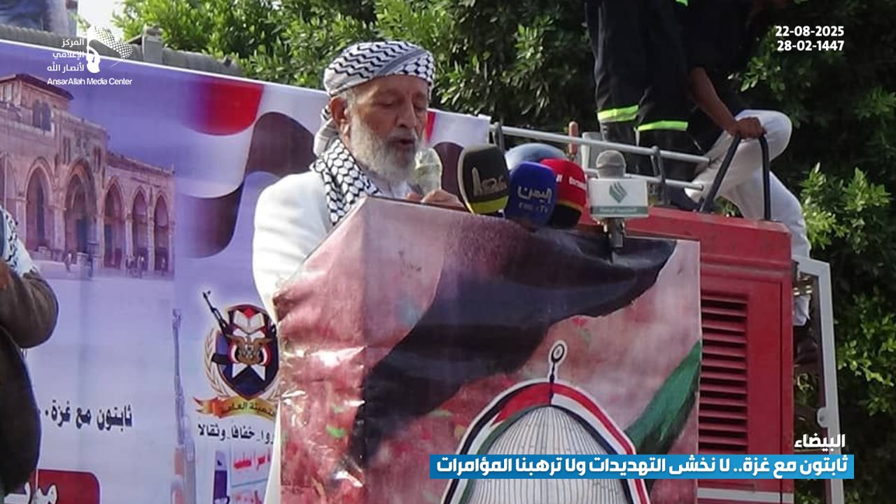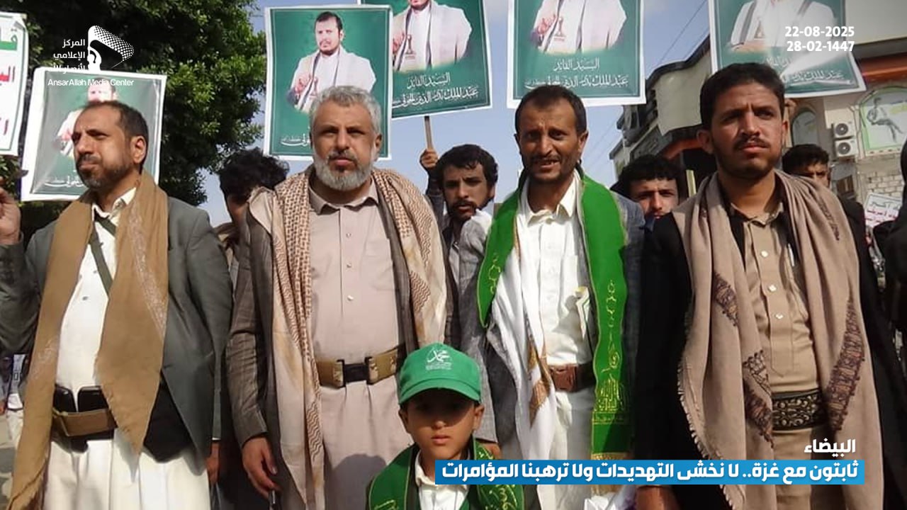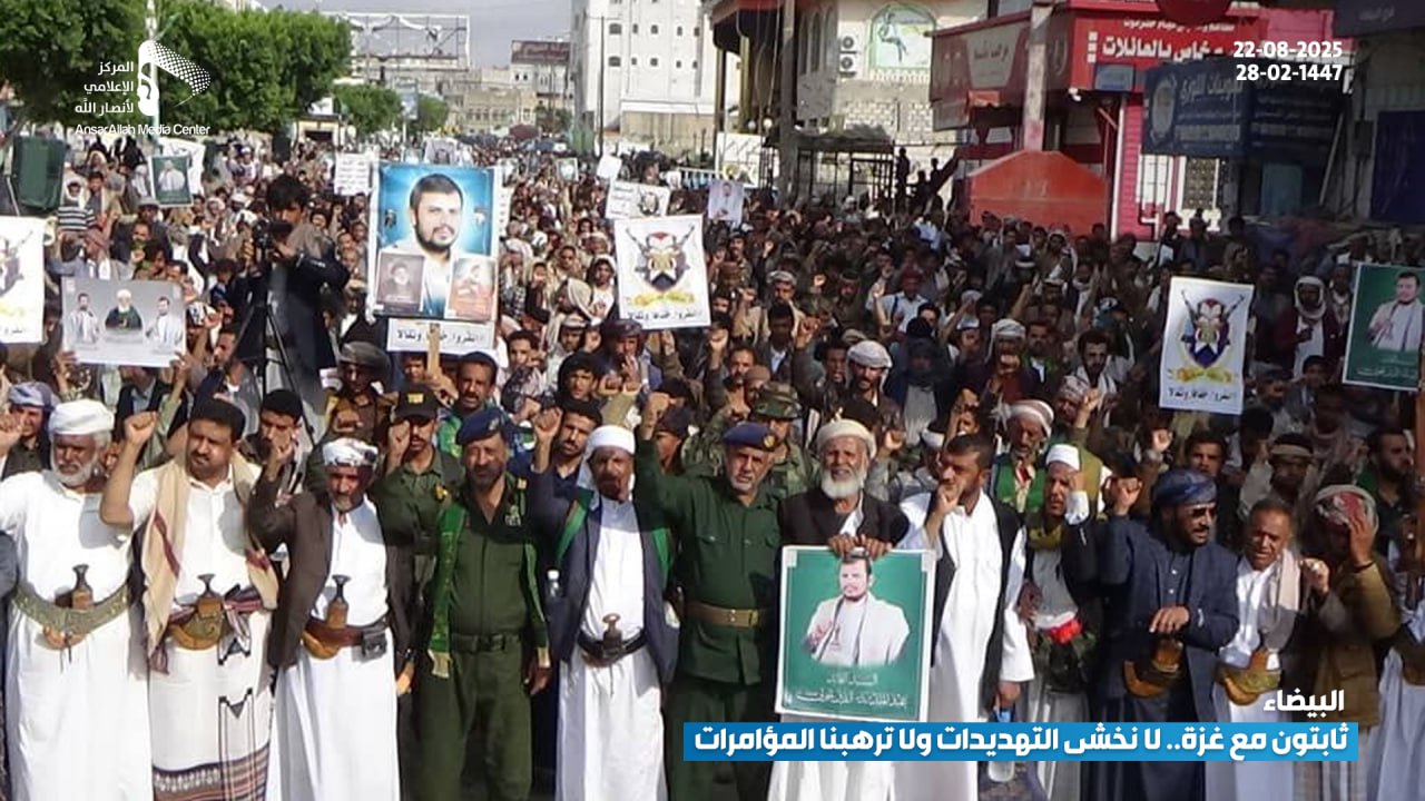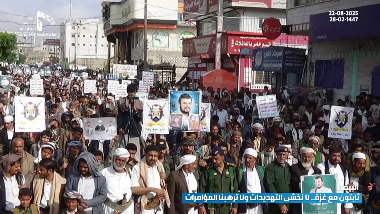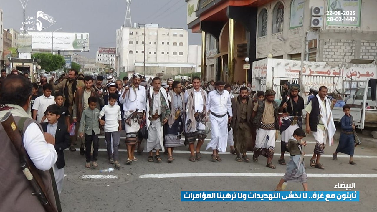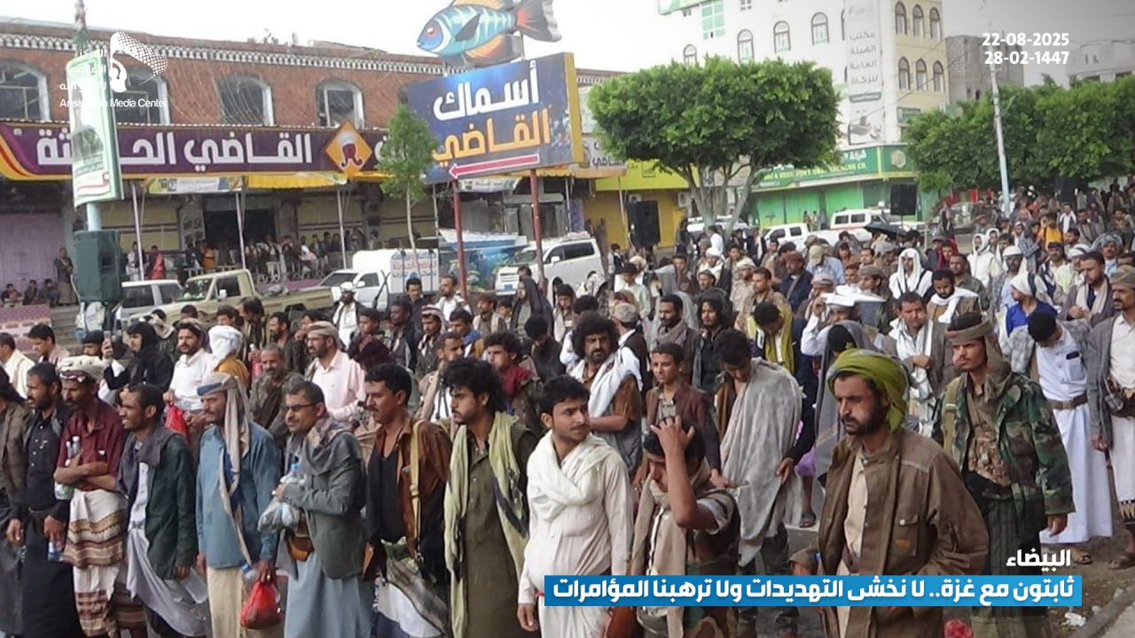 شهدت مدينة البيضاء، يوم أمس الجمعة، مسيرة جماهيرية حاشدة تحت شعار “ثابتون مع غزة.. لا نخشى التهديدات ولا ترهبنا المؤامرات”، حيث خرج أبناء المدينة بمختلف شرائحهم في مشهد يعكس تمسك اليمنيين بموقفهم الثابت والداعم للقضية الفلسطينية في مواجهة العدوان الصهيوني والمؤامرات التي تستهدف المقاومة.