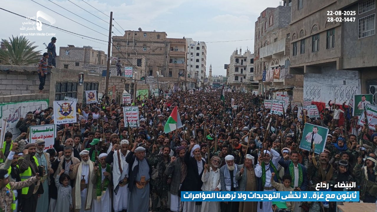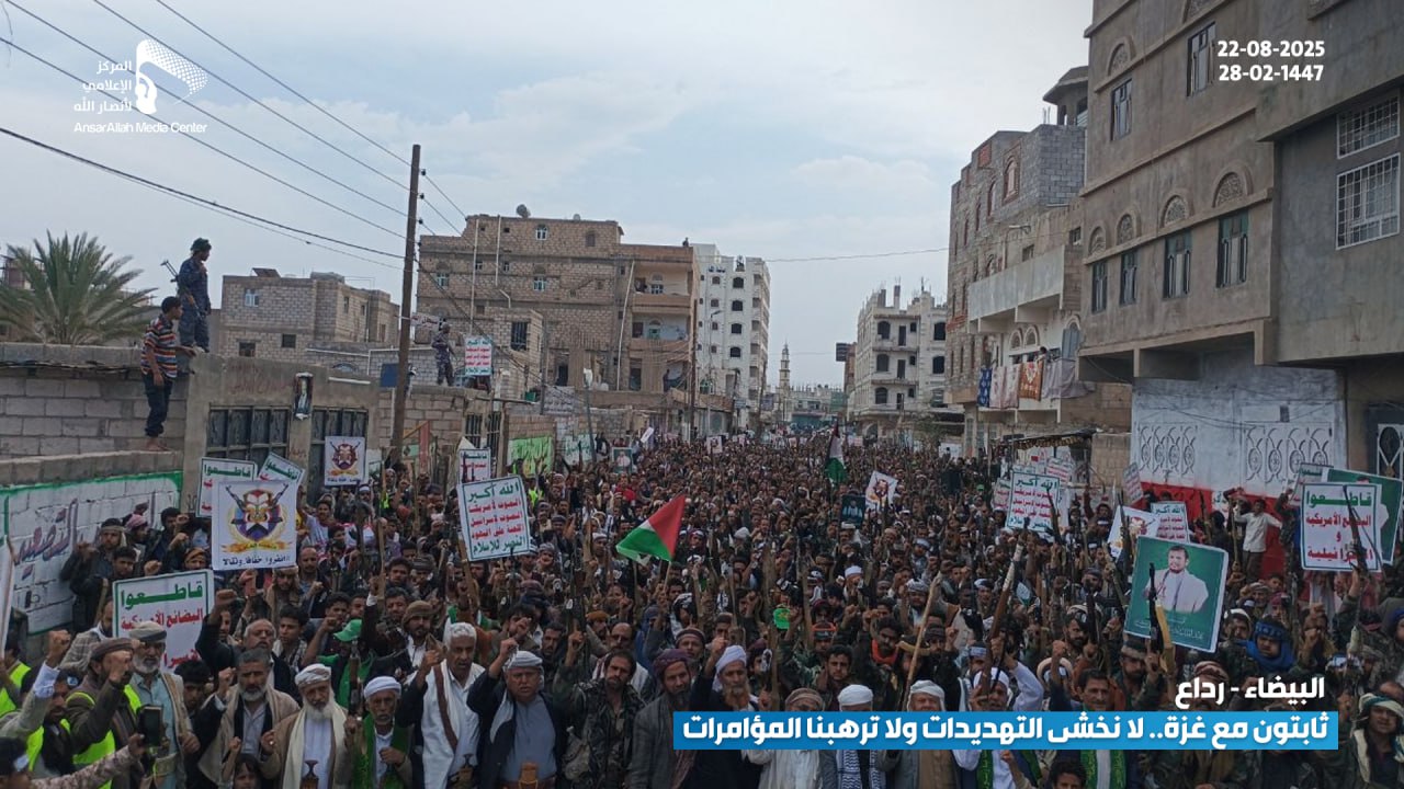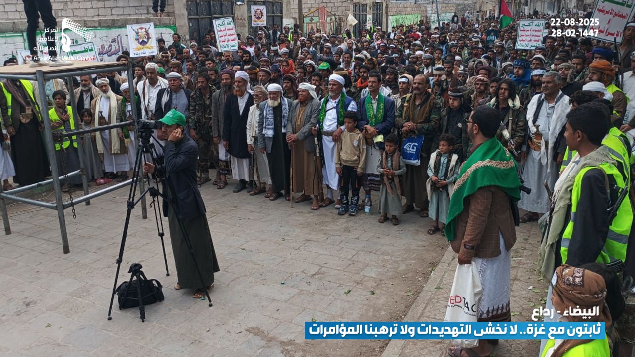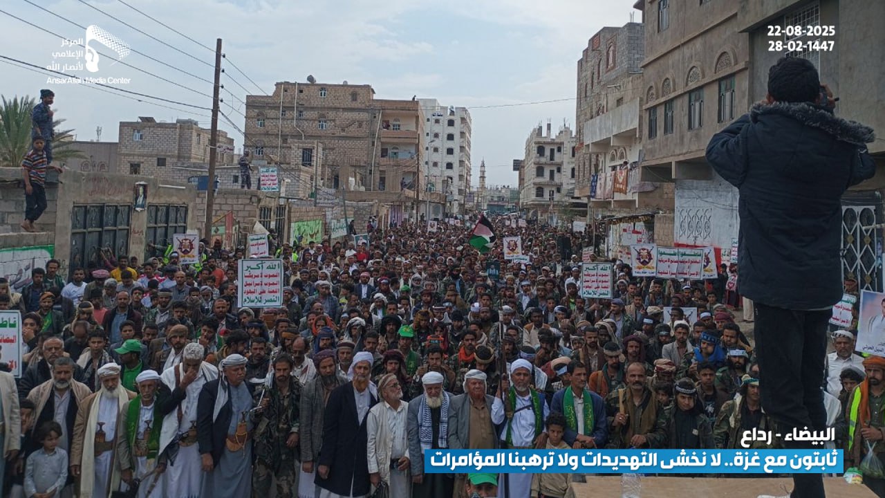 انطلقت في مديرية رداع بمحافظة البيضاء، يوم أمس الجمعة، مسيرة جماهيرية واسعة، عبّر خلالها المشاركون عن تضامنهم الثابت مع الشعب الفلسطيني في غزة، مؤكدين استمرار الموقف الشعبي الرافض للعدوان الصهيوني والحصار، ومشددين على أن التهديدات والمؤامرات لن تنال من صمود اليمنيين إلى جانب القضية الفلسطينية.
