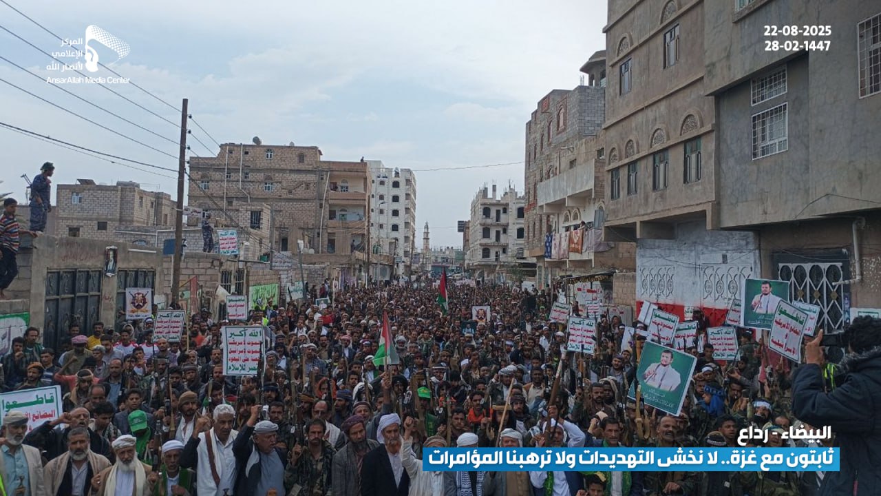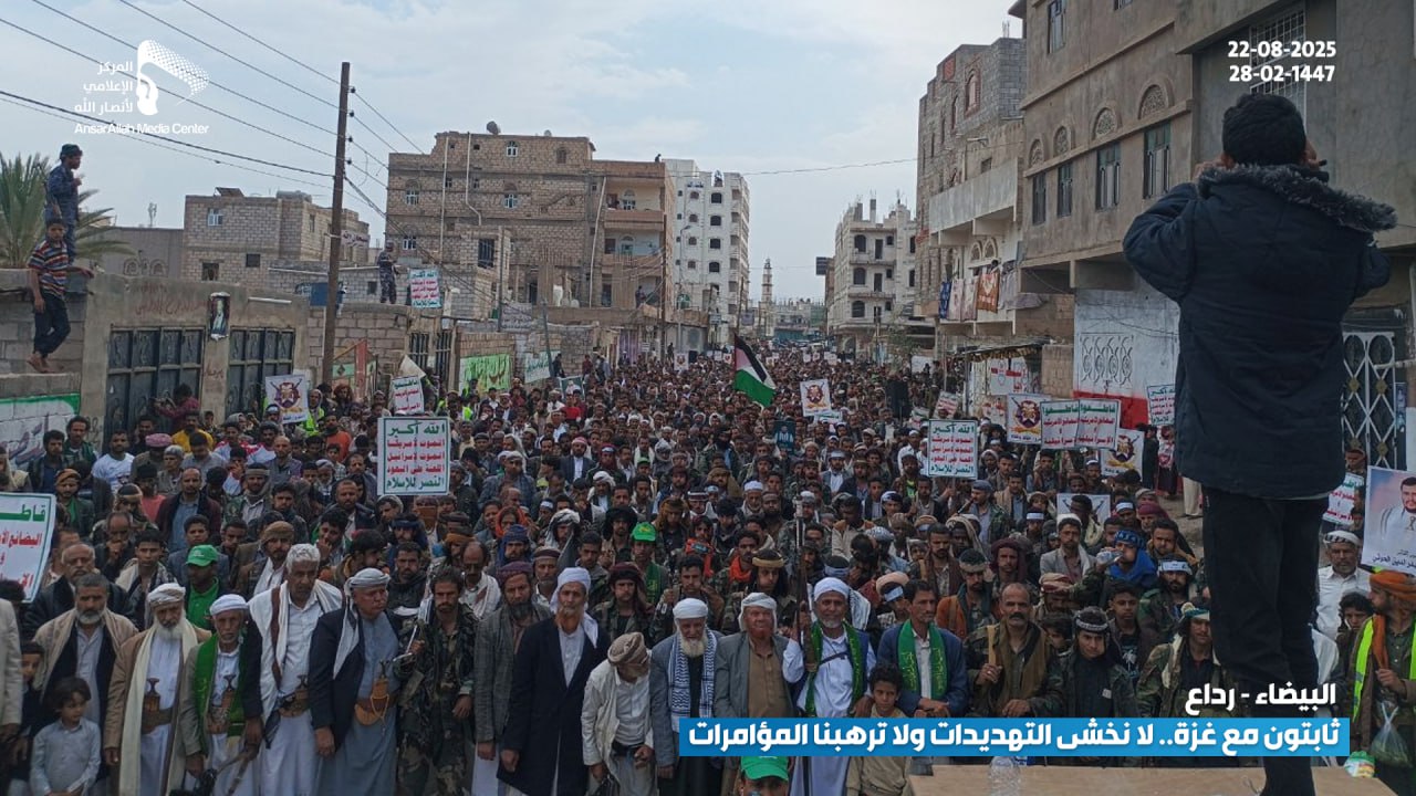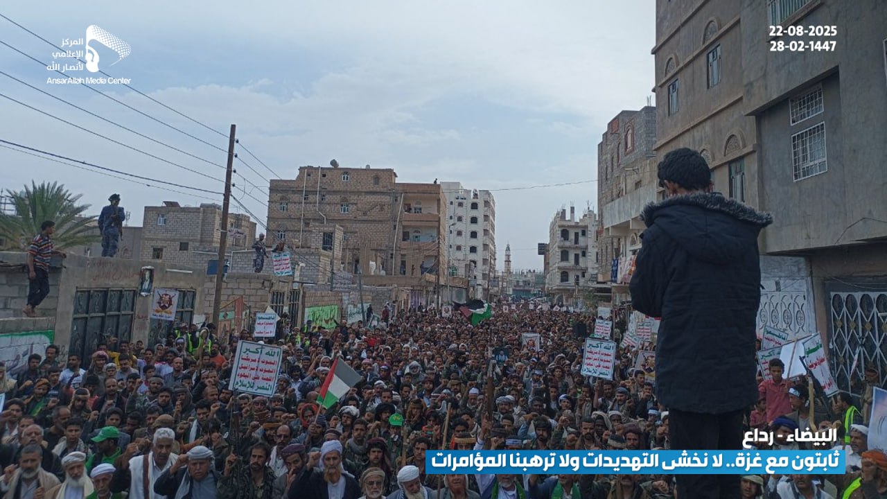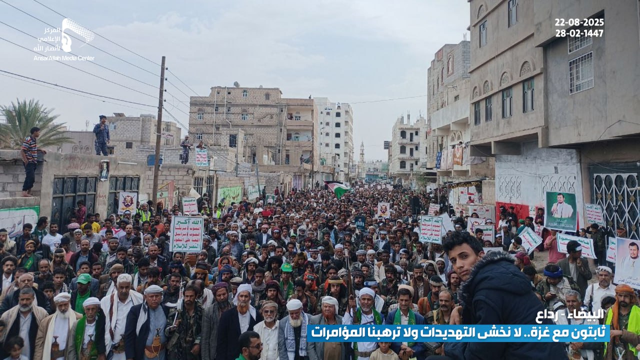 انطلقت في مديرية رداع بمحافظة البيضاء، يوم أمس الجمعة، مسيرة جماهيرية واسعة، عبّر خلالها المشاركون عن تضامنهم الثابت مع الشعب الفلسطيني في غزة، مؤكدين استمرار الموقف الشعبي الرافض للعدوان الصهيوني والحصار، ومشددين على أن التهديدات والمؤامرات لن تنال من صمود اليمنيين إلى جانب القضية الفلسطينية.