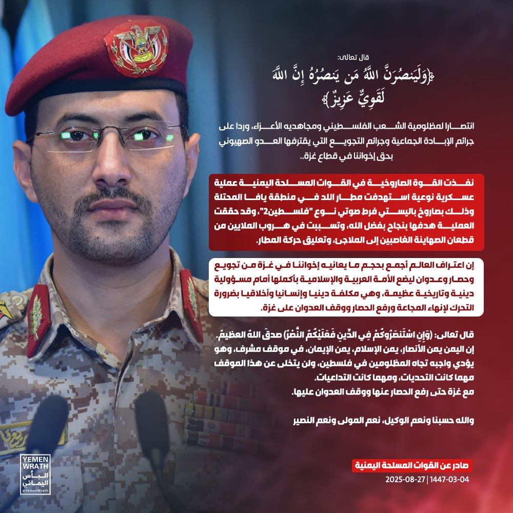 بيان القوات المسلحة اليمنية بشأن تنفيذ عملية عسكرية نوعية استهدفت مطار اللد في منطقة #يافا المحتلة بصاروخ باليستي فرط صوتي نوع #فلسطين2 البيضاء نت | صور #القوات_المسلحة_اليمنية Share FacebookTwitterGoogle+ReddItWhatsAppPinterestEmail