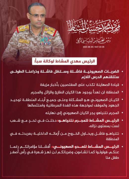 المشاط: الضربات الصهيونية فاشلة وذراعنا الطولى ستلقنهم الدرس