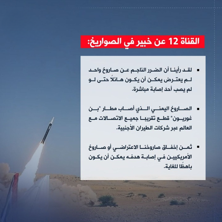 وفي سياق تحذيره قال خبير صواريخ إسرائيلي: “لقد رأينا أن الضرر الناجم عن صاروخ واحد لم يُعترض يمكن أن يكون هائلاً حتى لو لم يُصب أحد إصابة مباشرة”، وأوضح أن الصاروخ اليمني الذي أصاب مطار “بن غوريون” تسبب تقريبًا في قطع جميع الاتصالات مع العالم عبر شركات الطيران الأجنبية، مؤكداً أن “ثمن إخفاق صاروخنا الاعتراضي يمكن أن يكون باهظًا للغاية”.
