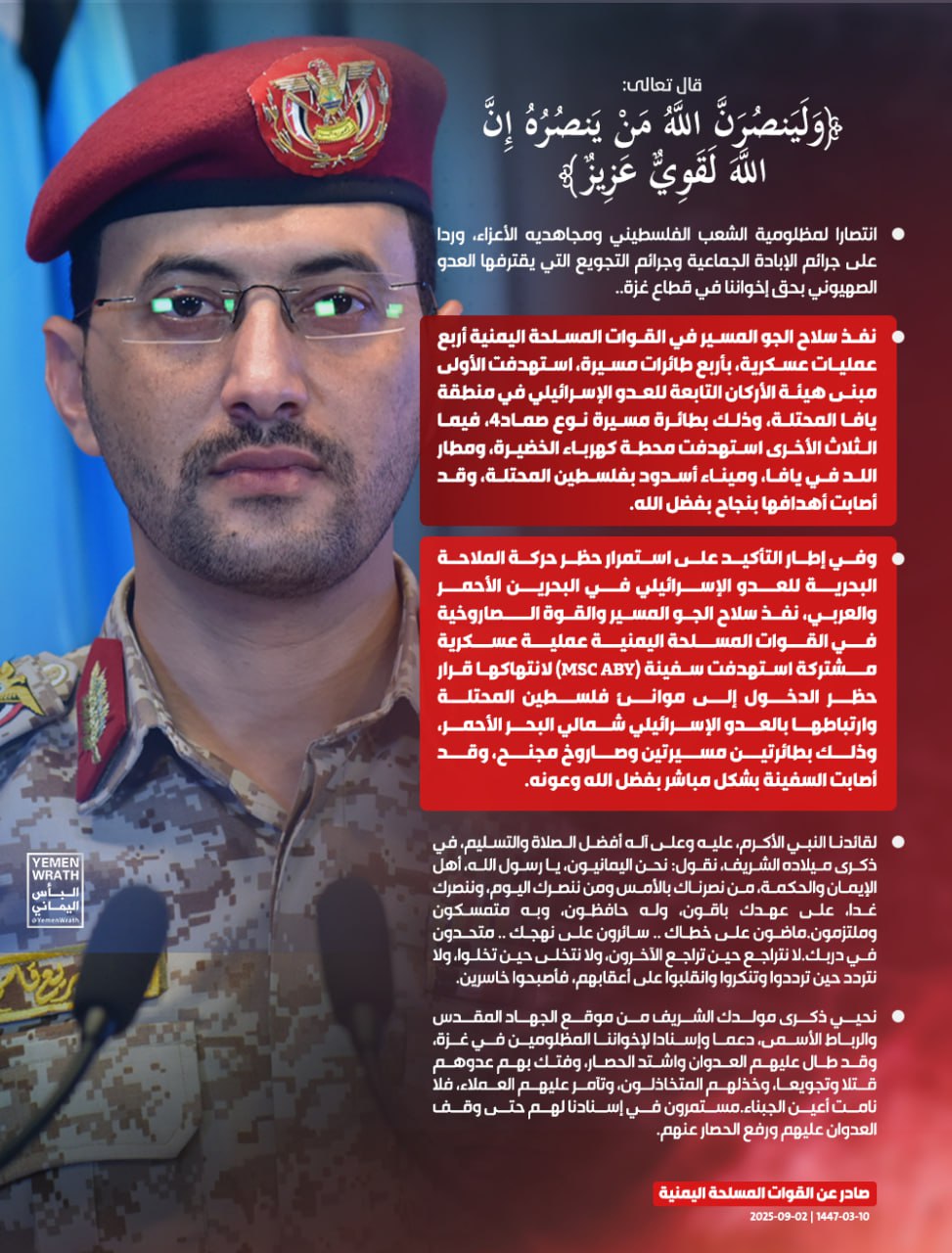 نفذت القوات المسلحة اليمنية عمليات نوعية استهدفت سفينة (MSC ABY) المرتبطة بالعدو الإسرائيلي، وشنّت هجمات داخل عمق الكيان الإسرائيلي في فلسطين المحتلة، مؤكدّة استمرار الرد الحازم على الاعتداءات.